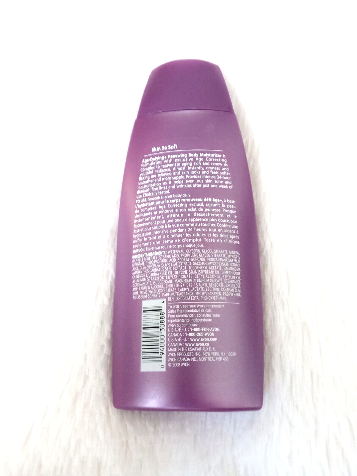 The Avon SKIN SO SOFT Renew Refresh Age-Defying Renewing Body Moisturizer is designed to minimize age spots, increase skin elasticity, and even out skin tone. It's formulated with patented radiance technology to help turn back the look of time. (New old stock - Product is new and unused)