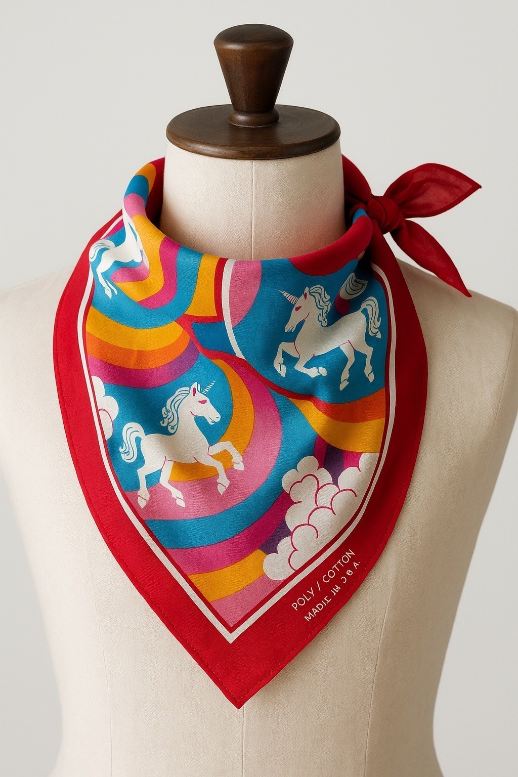 Vintage 1970s Rainbow Unicorn Bandana – Made in USA Poly Cotton Red Scarf