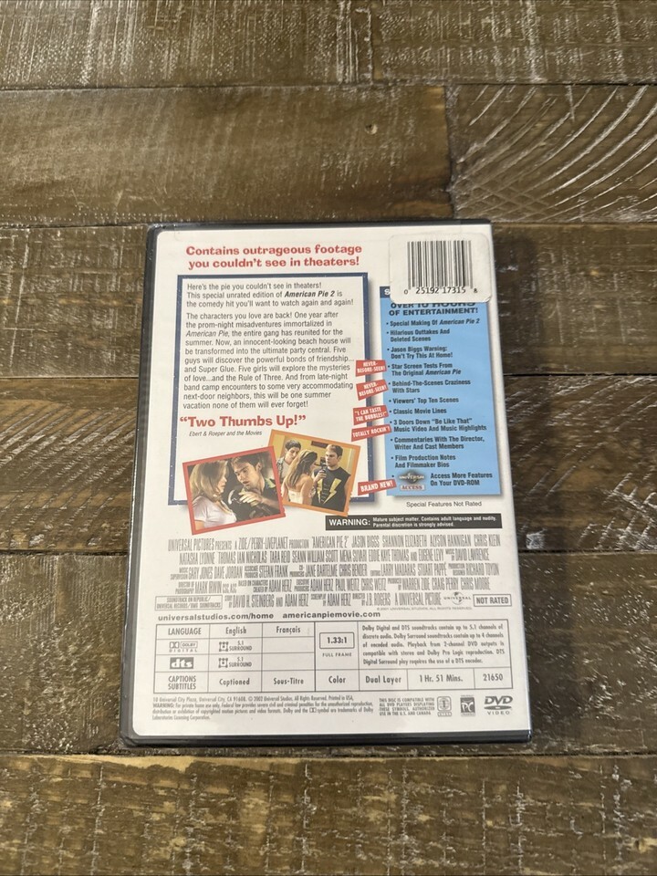 The American Pie 2 Unrated DVD is a film that falls under the comedy genre and is part of the popular American Pie series. The DVD format allows for easy viewing at home, and fans of the franchise can enjoy the hilarious and romantic storyline of the movie. With the unrated version, viewers can experience the film without any censorship, adding to the entertainment value for those seeking a more authentic viewing experience.