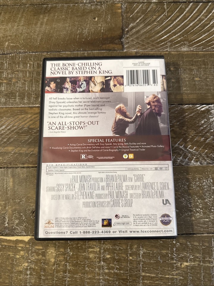 The "Carrie" DVD is a classic horror film directed by Brian De Palma and released in 1976. It features a runtime of 98 minutes and is rated R for its content. The DVD includes multiple language and subtitle options, including English, French, and Spanish. Produced by MGM, this DVD presents the chilling tale of the possessed young girl, Carrie, in a format that allows fans to enjoy the gripping storyline and terrifying Atmosphere of the film from the comfort of their own homes.