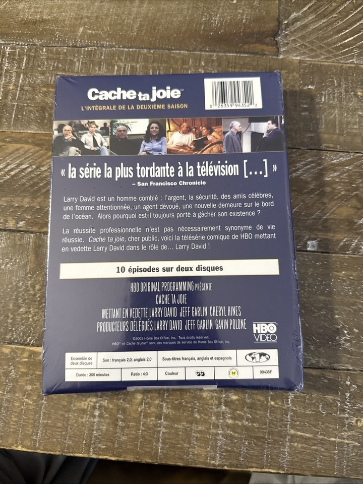 The "Cache Ta Joie" DVD is a French-language Canadian edition of the TV show "Curb Your Enthusiasm: The Complete Second Season." Starring Larry David, this comedy series offers a unique blend of humor and storytelling that has captivated audiences. With its entertaining episodes and talented cast, this DVD is sure to be a hit among fans of the show looking to add it to their collection.
