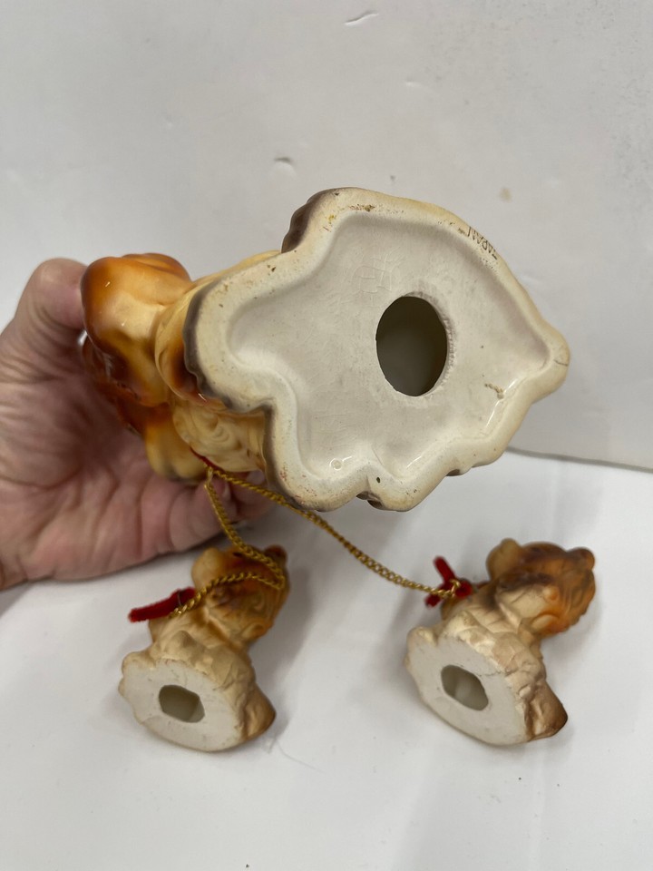 Vintage Ceramic/Bisque Pekingese Mom Dog and 2 Puppies on Chains