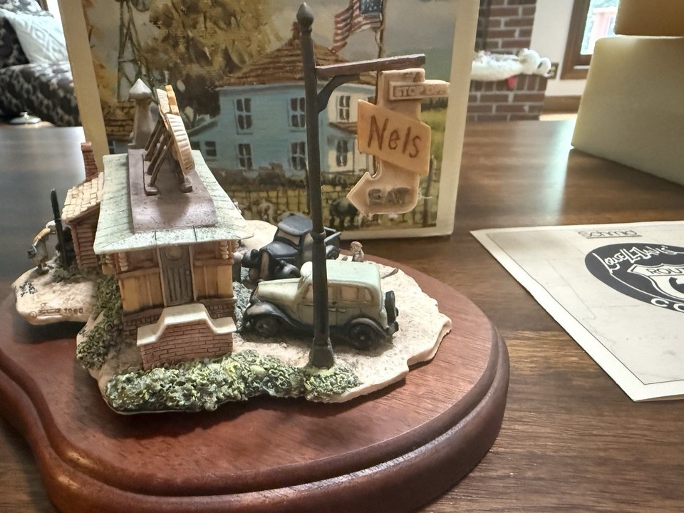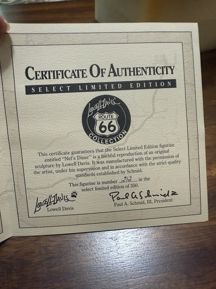 Lowell Davis "Nel's Diner" Figurine Collector's Set. This highly collectible vintage (1990) set by the famous American artist, Lowell Davis is part of a Select Limited Edition ( I have 12pc, I will send one of the 12 / 350 Limited Numbers) There were only 350 of these sets ever made, and this is a complete set. The figurine is also double signed!!! It has the Lowell Davis stamp as well as the personal autograph of Lowell Davis himself. The figurine is made of cold cast porcelain and was made and hand painted in Scotland by Border Fine Arts. The figurine is in excellent condition, and it is personally signed by Lowell Davis. It has the Lowell Davis stamp as well as the personal autograph of Lowell Davis himself. The set includes the figurine, the wood base with brass name plate, the COA, the story card, the Route 66 asphalt piece, and the original box with the foam insert.