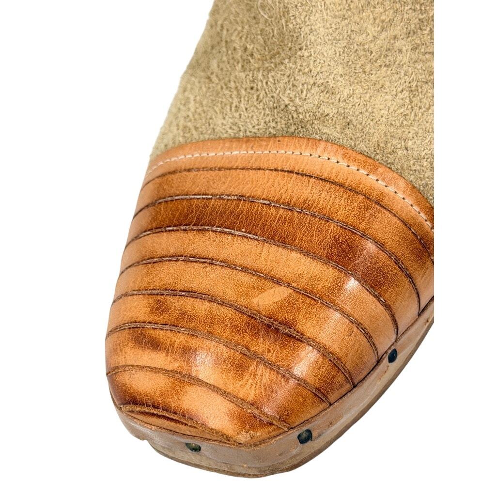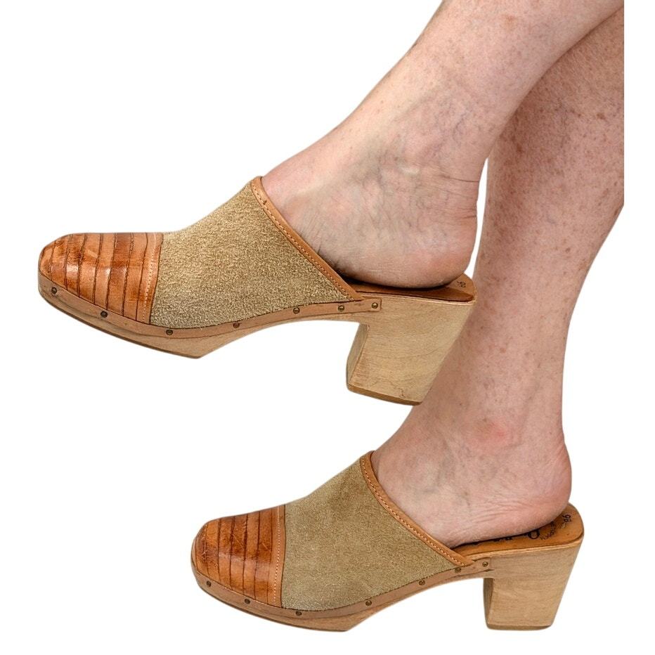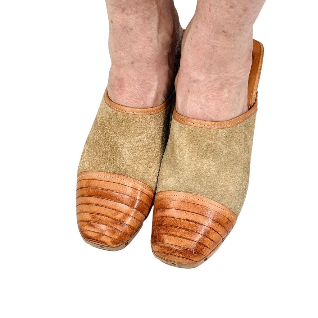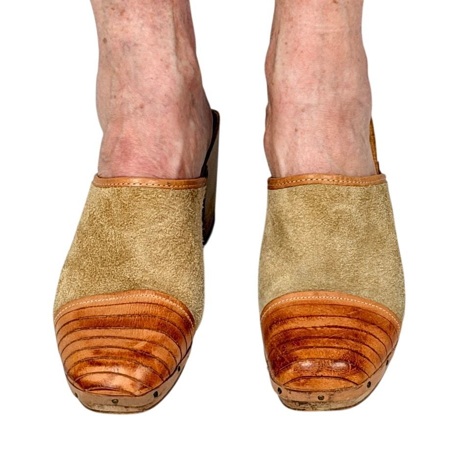 VTG 1970s QualiCraft Tan Suede & Leather Wood Heel Clogs Boho Annie Hall 9B