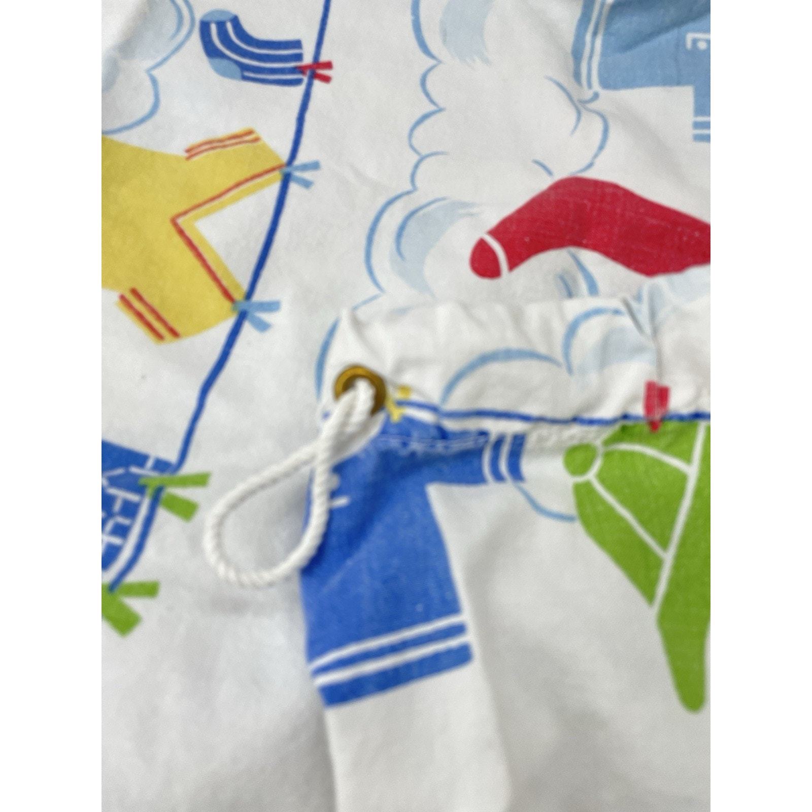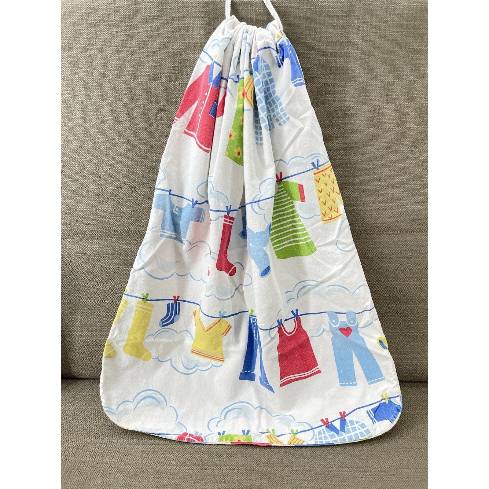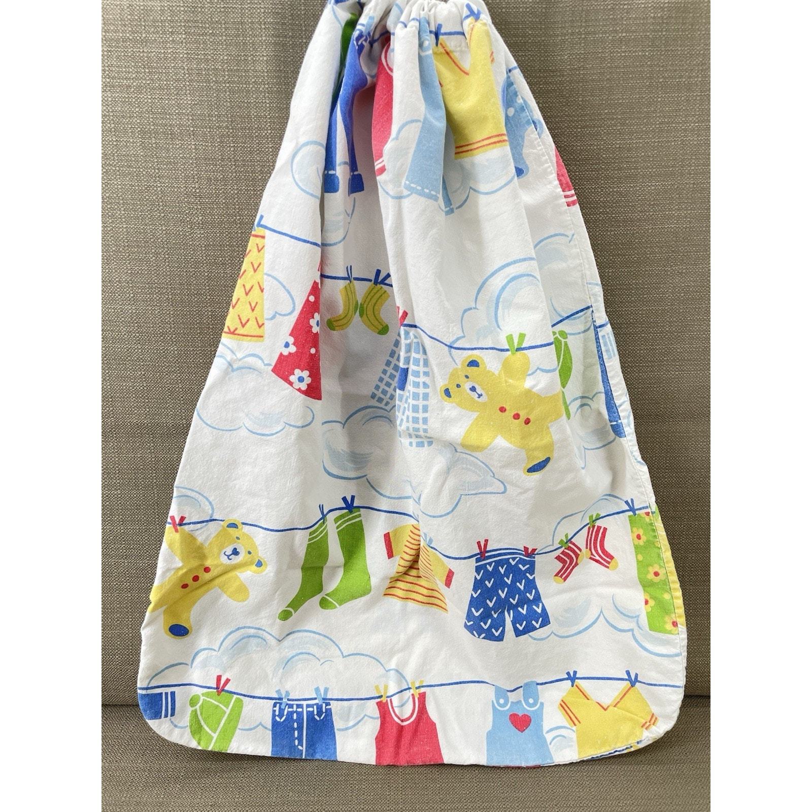 Cheerful and bright, this vintage drawstring tote bag features a whimsical clothesline print with laundry in bold primary colors against a white background. Likely from the 1970s, this retro fabric bag is perfect for kids? laundry, toys, or as charming nursery decor. In excellent condition with no rips or stains.
