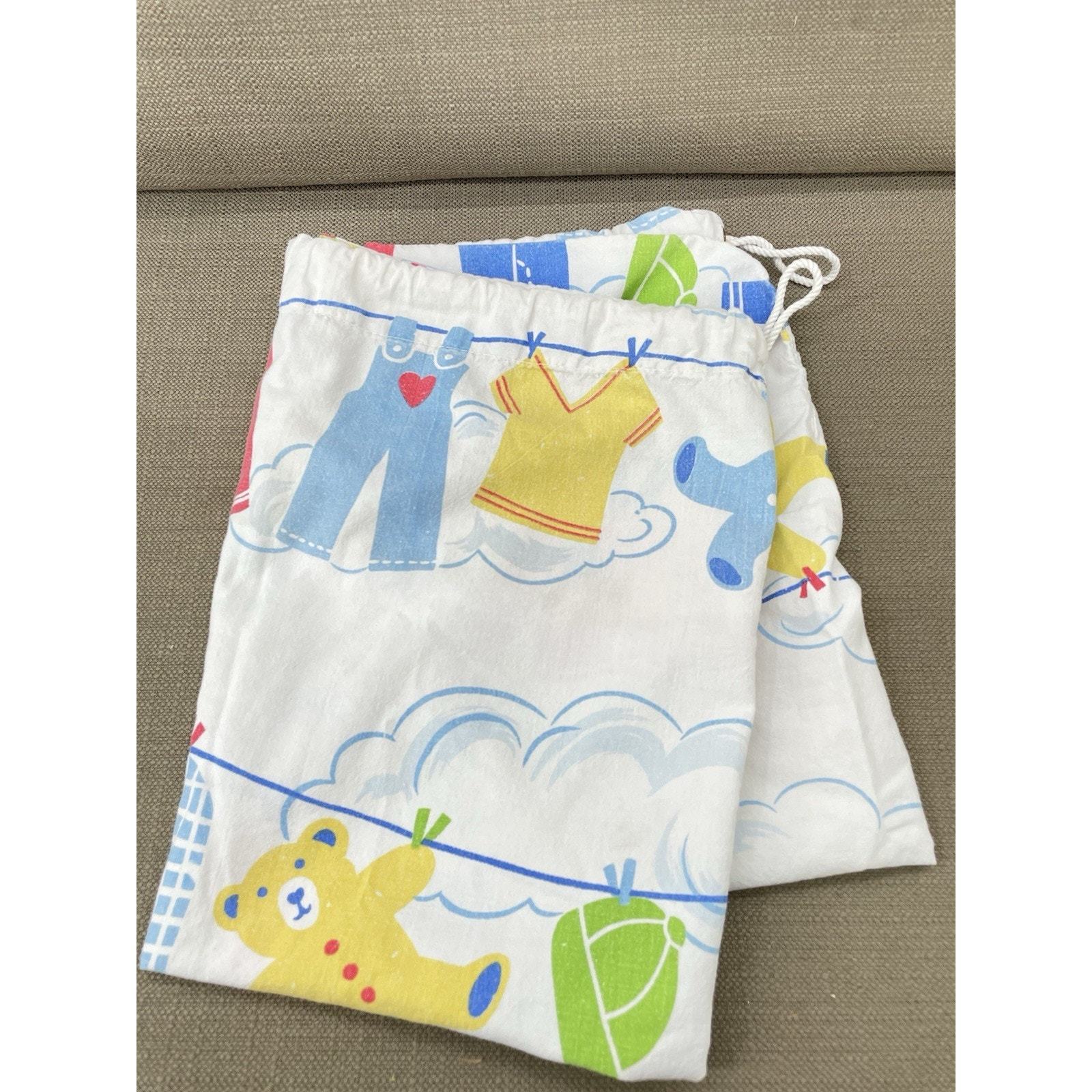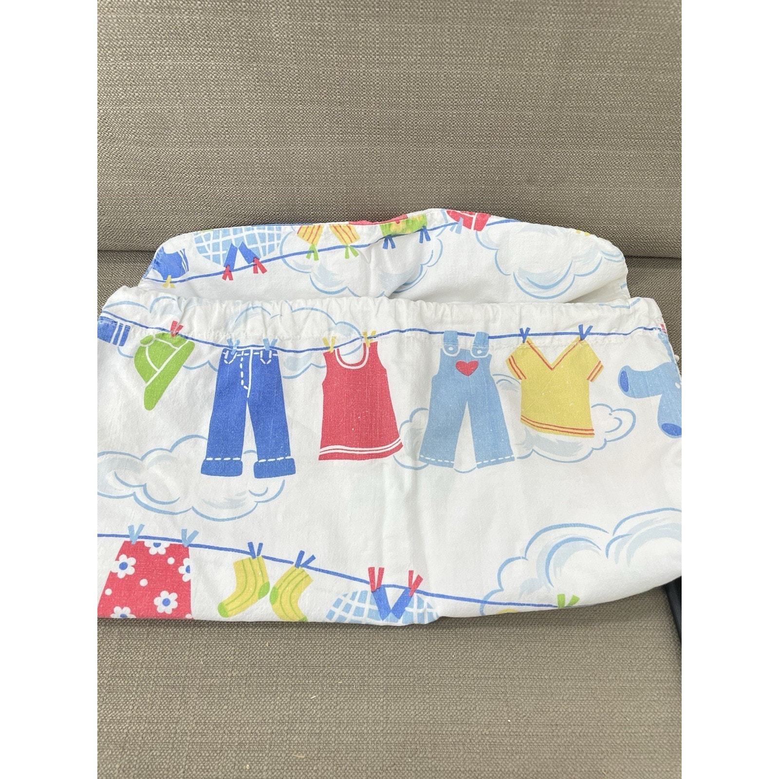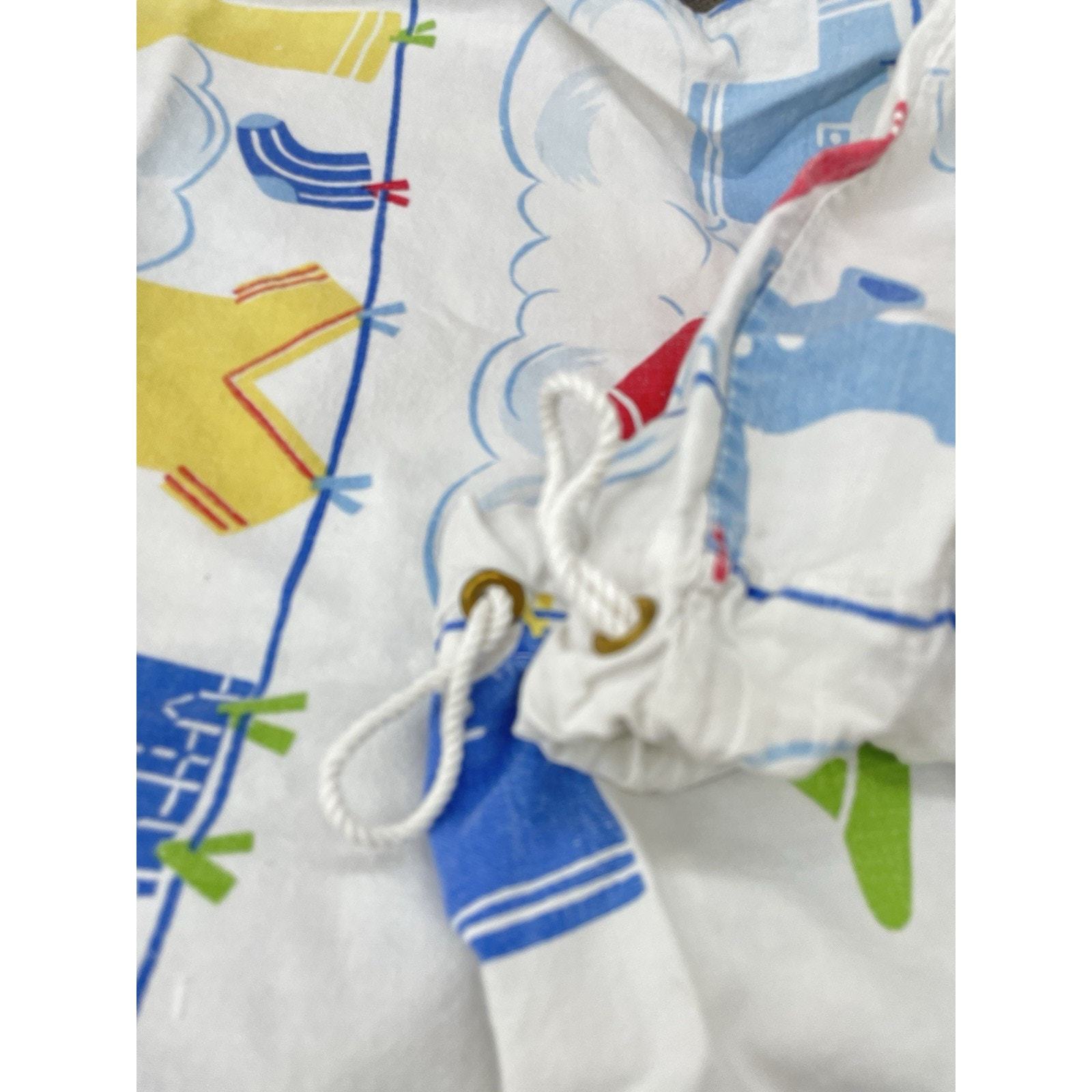 Cheerful and bright, this vintage drawstring tote bag features a whimsical clothesline print with laundry in bold primary colors against a white background. Likely from the 1970s, this retro fabric bag is perfect for kids? laundry, toys, or as charming nursery decor. In excellent condition with no rips or stains.
