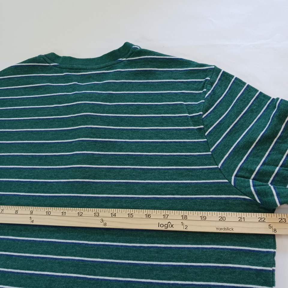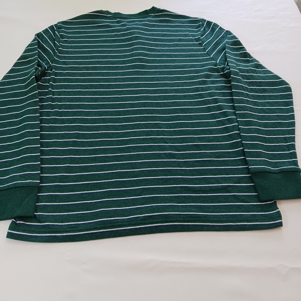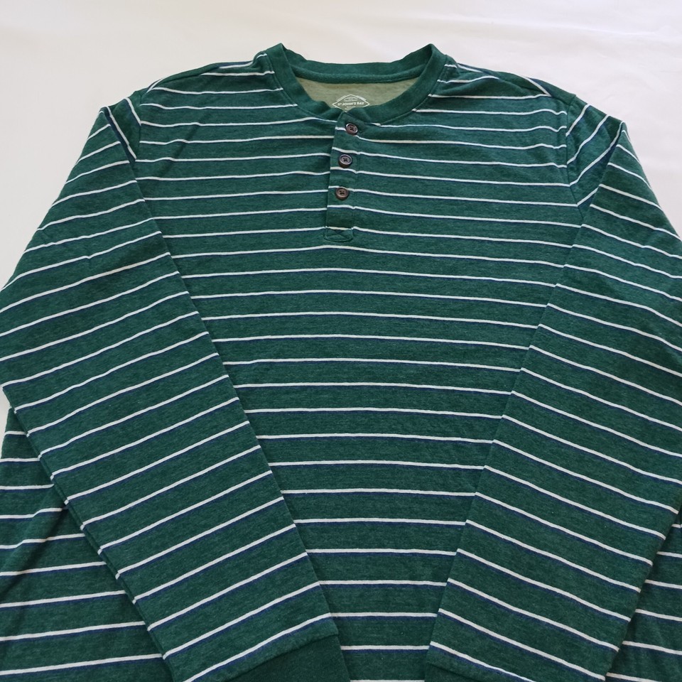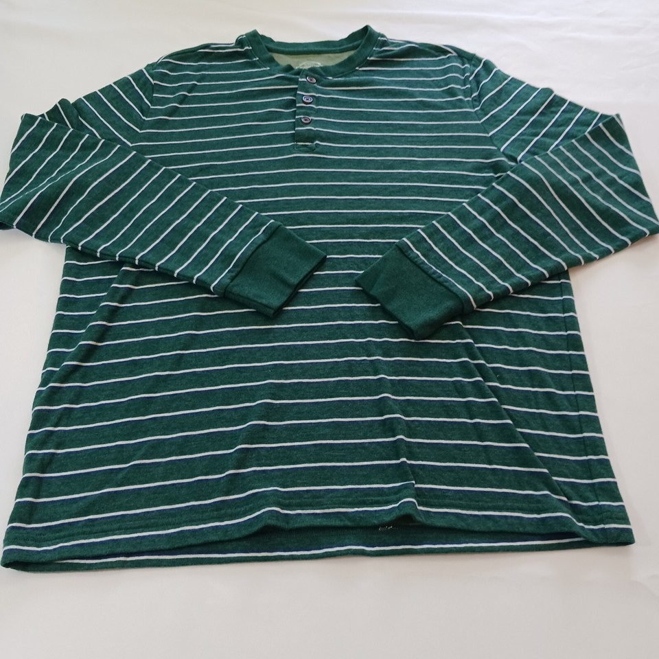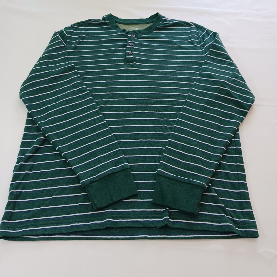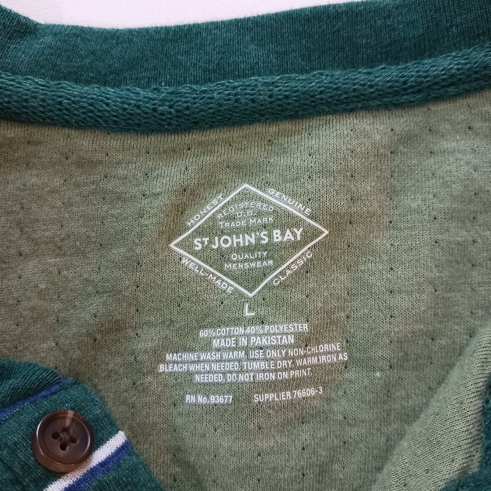 St. John's Bay Men's Green White Stripes Cotton Blend Shirt Size Large is a classic and preppy T-shirt for men. Made of a comfortable and breathable knit fabric, it features a solid green and white stripe pattern with long sleeves and a button accent. The shirt is machine washable and tagless, making it easy to care for and wear in all seasons. It is available in a regular fit and size type. Ideal for outdoor activities, this shirt is perfect for winter, fall, and spring.