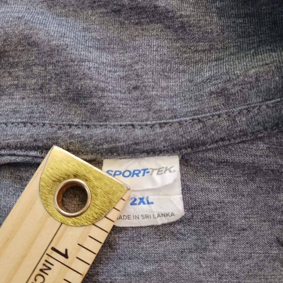 This is a gray Sport-Tek pullover shirt for men in size 2XL. It has a mock neck and a 1/4 zipper closure. The shirt is made of a cotton blend fabric with a medium wash. It features a solid pattern with a logo accent. The shirt has long sleeves and a regular fit. It is suitable for activewear occasions such as golf, crossfit, and hiking. The shirt has a classic sports theme and is made in Sri Lanka.
