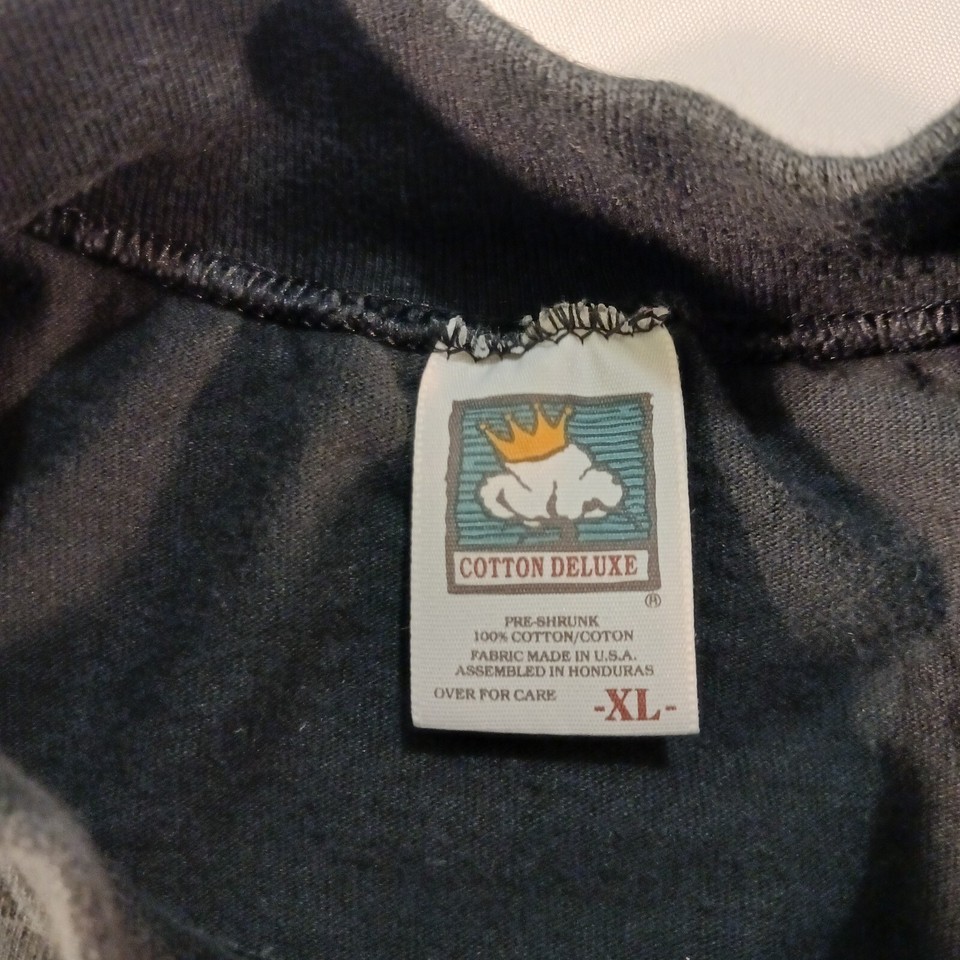 This vintage Cotton Deluxe black t-shirt is a must-have for any retro enthusiast. Made of pre-shrunk cotton material, it offers a comfortable fit in size XL with long sleeves. The graphic design on the shirt adds a unique style to any outfit and the original 1990s piece is a great addition to any vintage clothing collection.