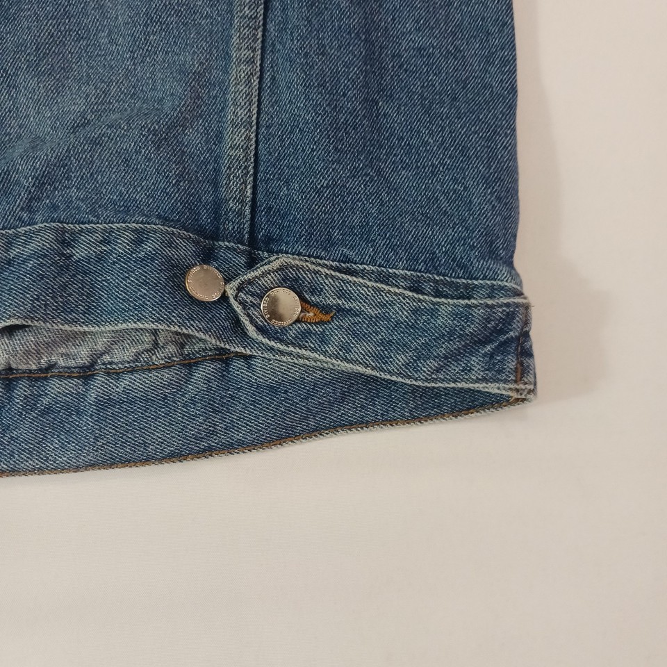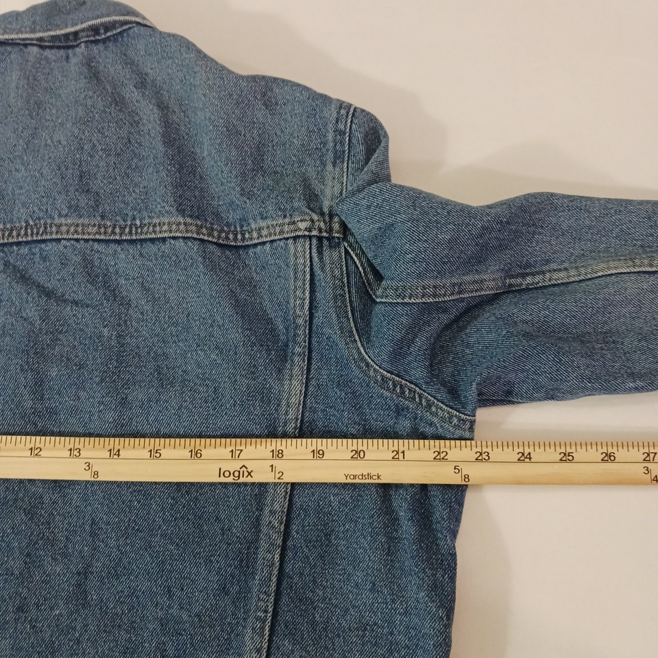 This women's blue denim jacket in size 12 is made of cotton denim, featuring a solid pattern and classic fit. The jacket has a 27-inch length and long sleeves, with a button closure for easy wear. Ideal for everyday wear, this basic jacket from Bangladesh is perfect for adding a stylish touch to your wardrobe while being comfortable and durable.