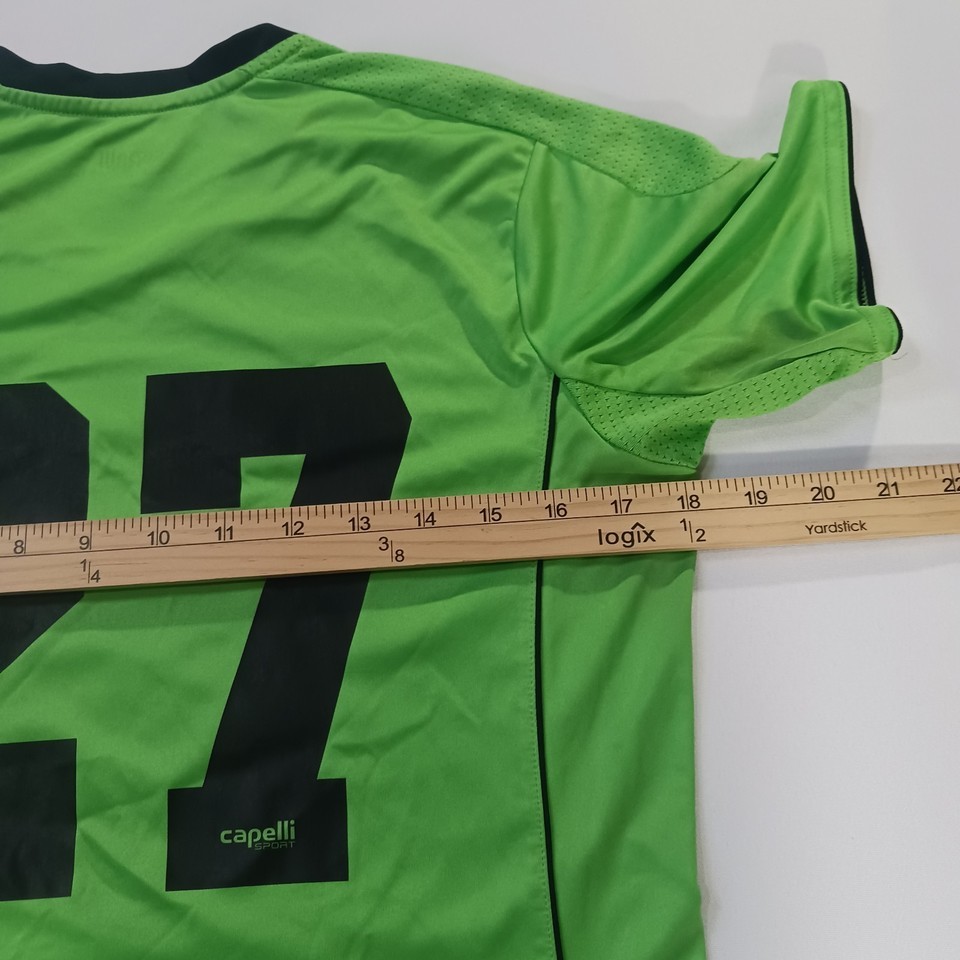 The Capelli Sport Miami Rush Soccer Green Jersey is a stylish and comfortable activewear top designed for youth players. Made from high-quality jersey fabric, this shirt is perfect for soccer matches and other athletic activities. The green color and sports theme make it a great choice for young athletes looking to stand out on the field. The size M #27 ensures a perfect fit for teens, while the brand Capelli New York guarantees both style and quality.