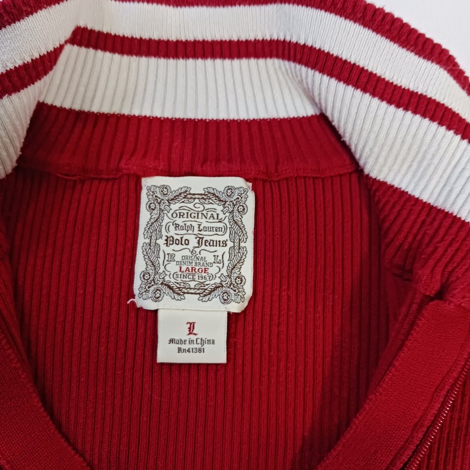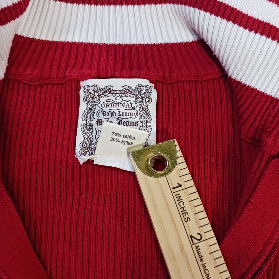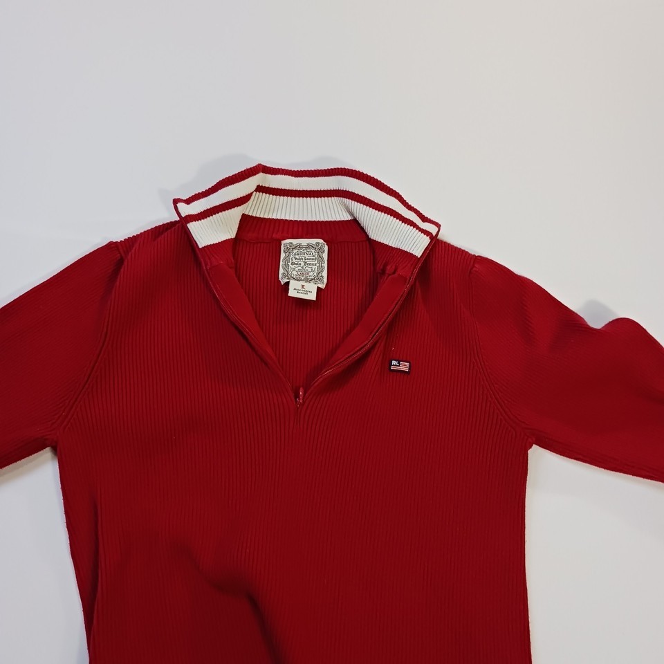This vintage original Ralph Lauren Polo Jeans men's 1/4 zip pullover sweater in size L offers a classic and stylish addition to any man's wardrobe. Made from a blend of nylon and cotton, this red sweater features a solid pattern and long sleeves, perfect for cooler weather. The pullover style with a 1/4 zip detail adds a touch of functionality to this timeless piece, which is sure to stand out with its iconic Polo Jeans Co. branding. Made in China, this sweater combines quality craftsmanship with a touch of retro charm.
