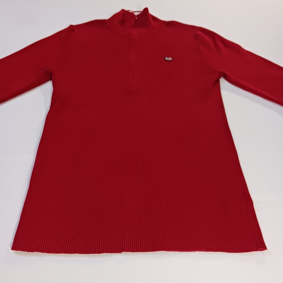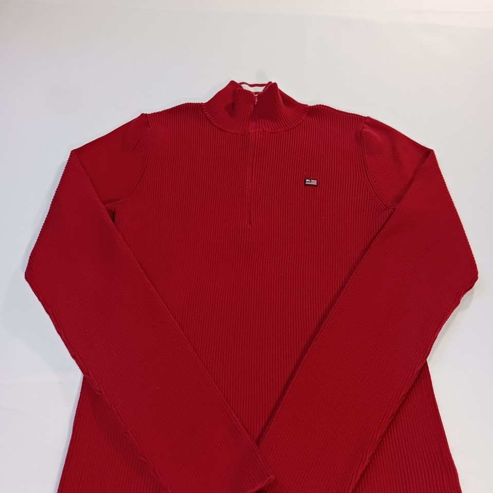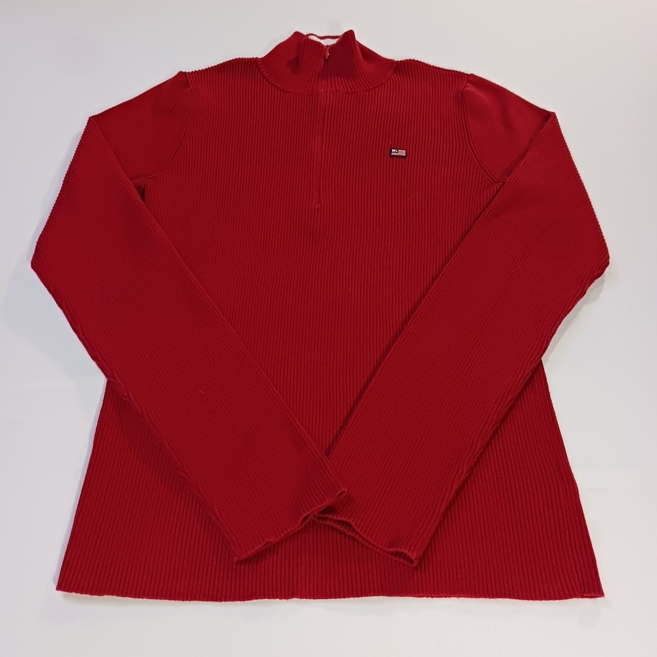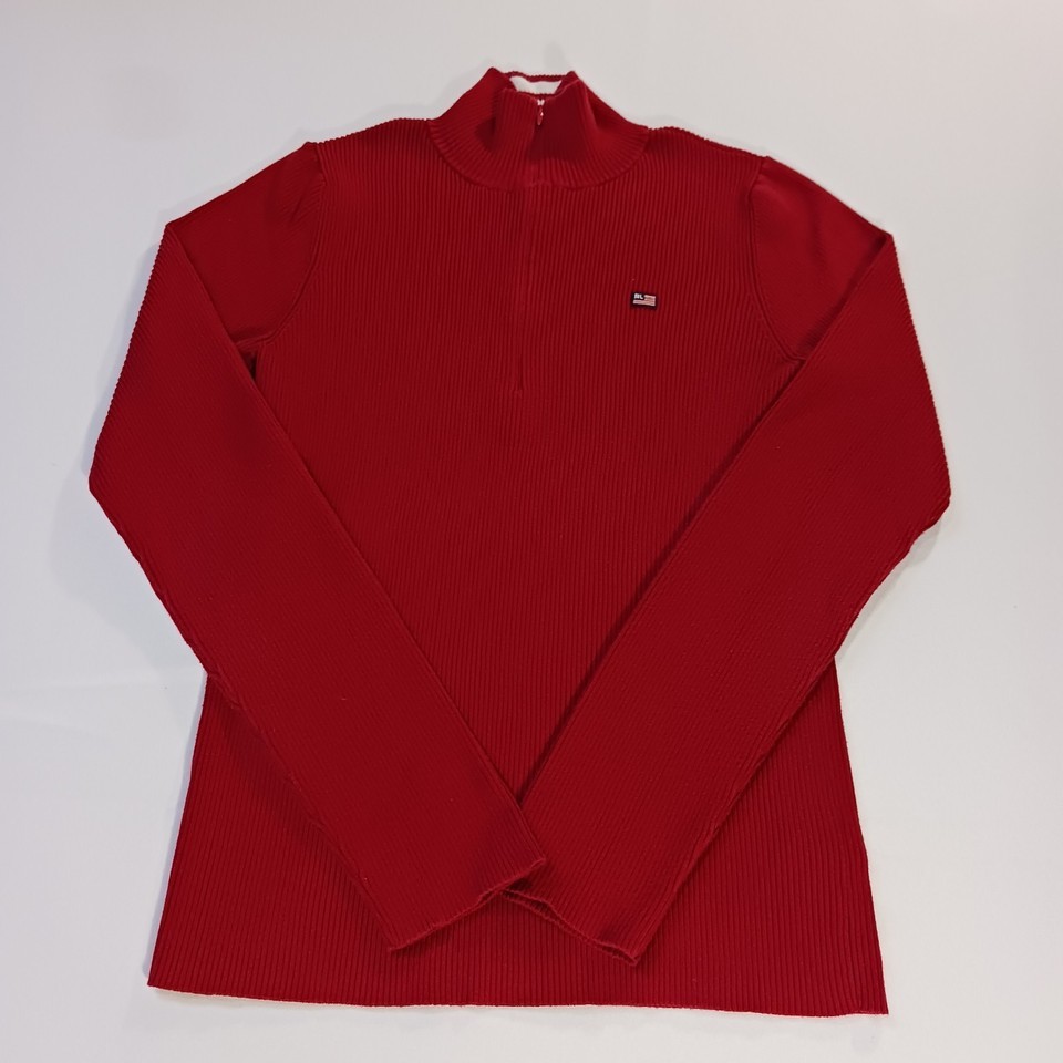 This vintage original Ralph Lauren Polo Jeans men's 1/4 zip pullover sweater in size L offers a classic and stylish addition to any man's wardrobe. Made from a blend of nylon and cotton, this red sweater features a solid pattern and long sleeves, perfect for cooler weather. The pullover style with a 1/4 zip detail adds a touch of functionality to this timeless piece, which is sure to stand out with its iconic Polo Jeans Co. branding. Made in China, this sweater combines quality craftsmanship with a touch of retro charm.