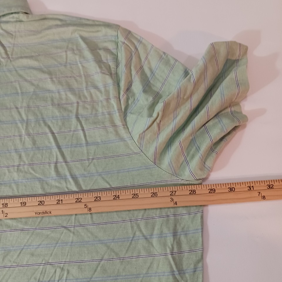 This Jos A Bank polo shirt is designed for big and tall men, featuring a traditional fit with green stripes. Made of cotton, it has a pullover closure with short sleeves and a chest size of 57 inches. The shirt is 31.5 inches long, suitable for a size 4XLT. Perfect for golfing, it is part of the Classic Collection and bears the Jos A Bank brand. The shirt is ideal for a regular fit and is crafted in India.