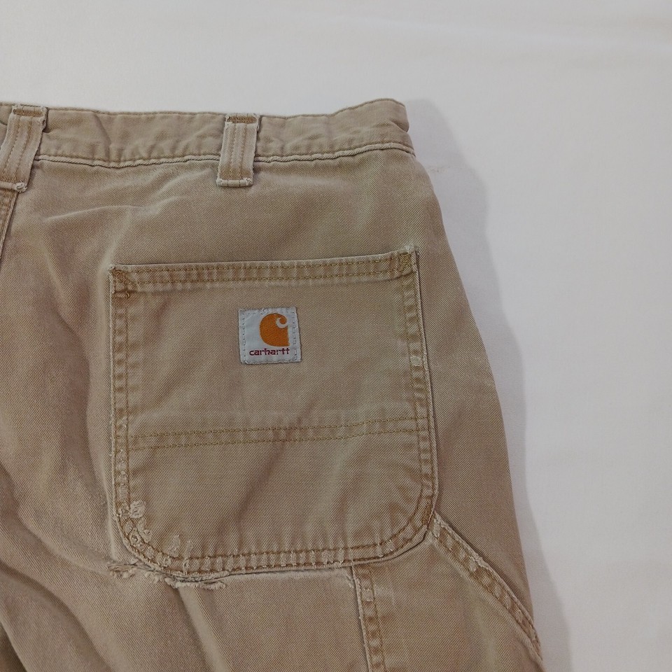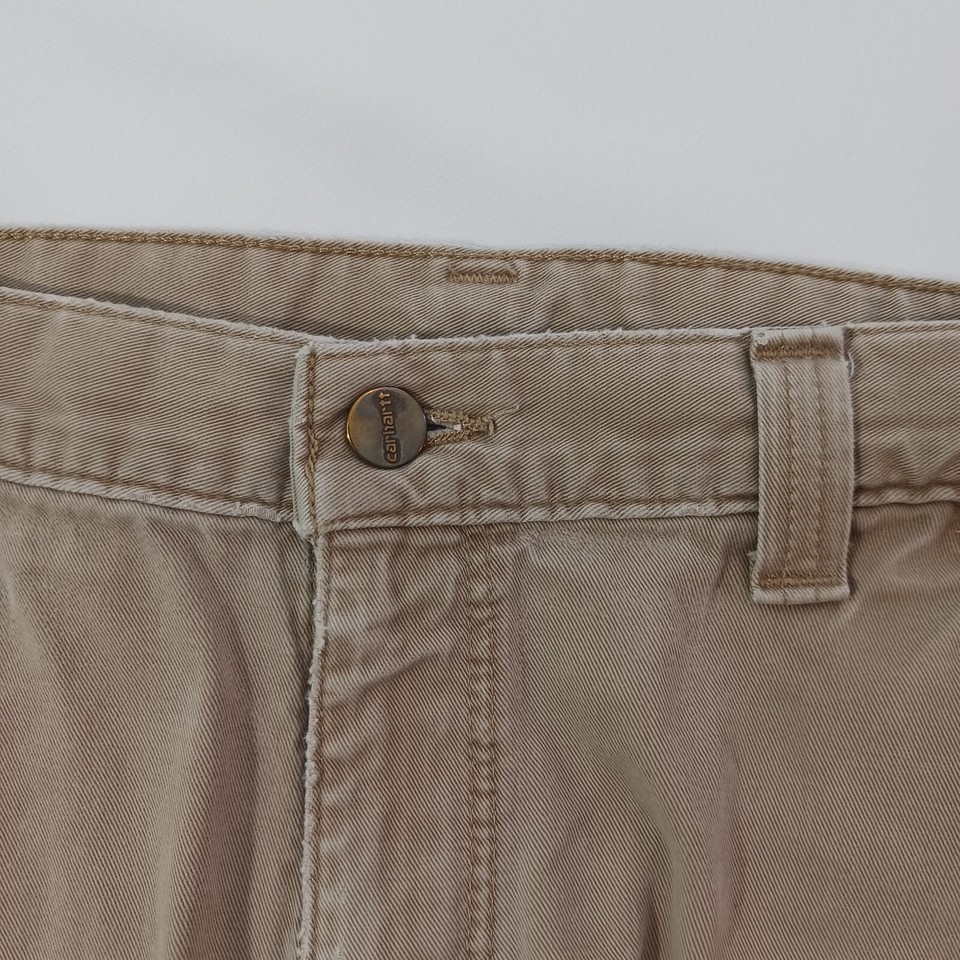 The pants have a solid beige color and a classic American outdoor theme, with accents such as buttons, zippers, and the Carhartt logo. They also have cargo pockets for easy access to your essentials. These pants are easy to care for and machine washable, making them a practical addition to your wardrobe.