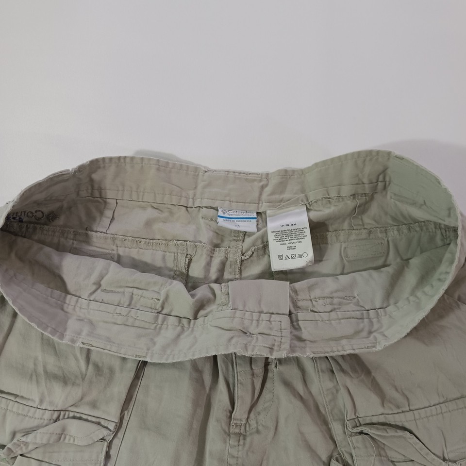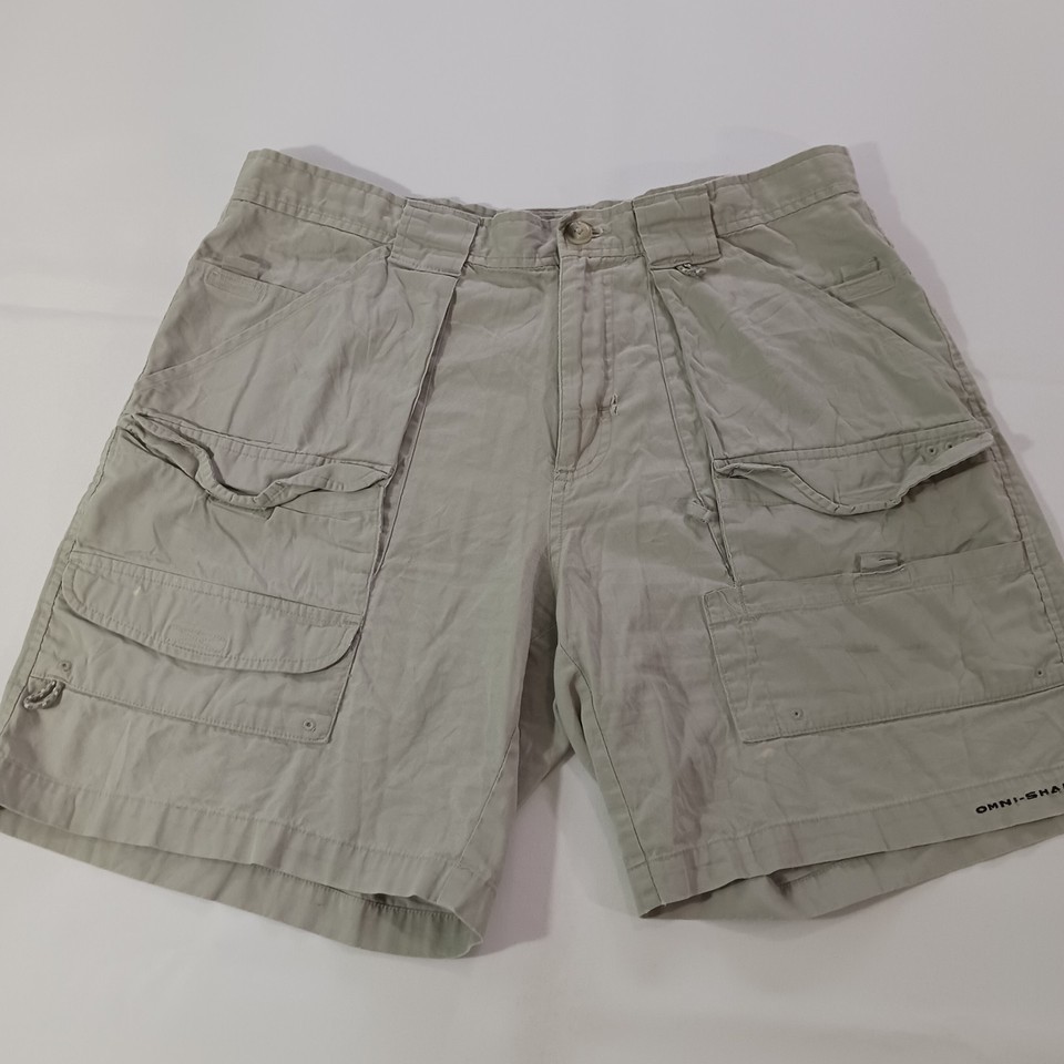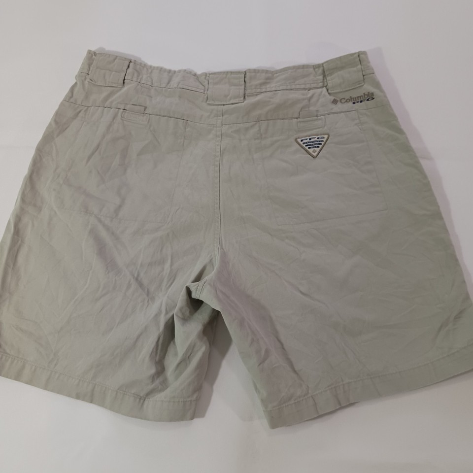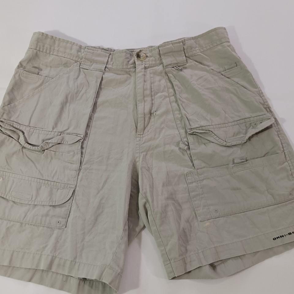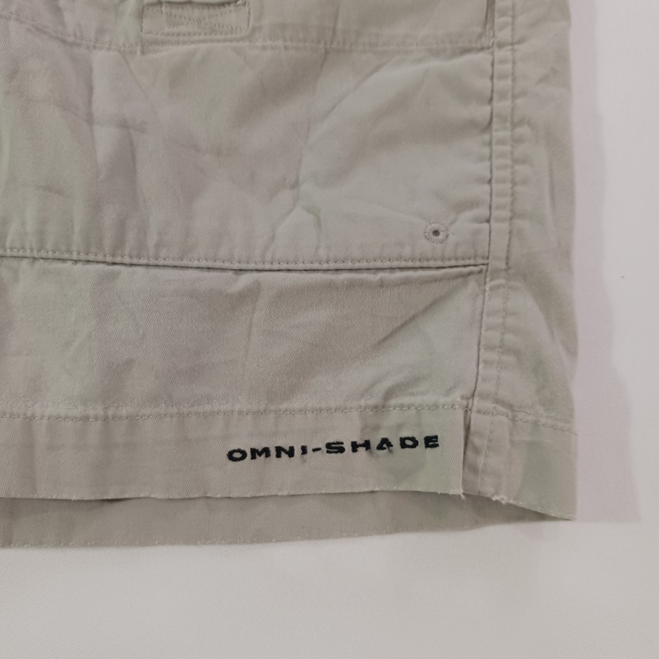The Columbia PFG Omni-Shade FM4536 Men's Tan Cotton Cargo Shorts in size 34 feature a solid khaki color and a mid-rise style with an 8-inch inseam. Designed for outdoor activities like fishing, boating, hiking, and camping, these shorts are made of lightweight cotton material with a stretchy and quick-drying fabric. The elastic waist provides comfort, while the cargo pockets offer convenient storage. Machine washable and easy to care for, these Columbia shorts are a practical and stylish choice for casual wear.