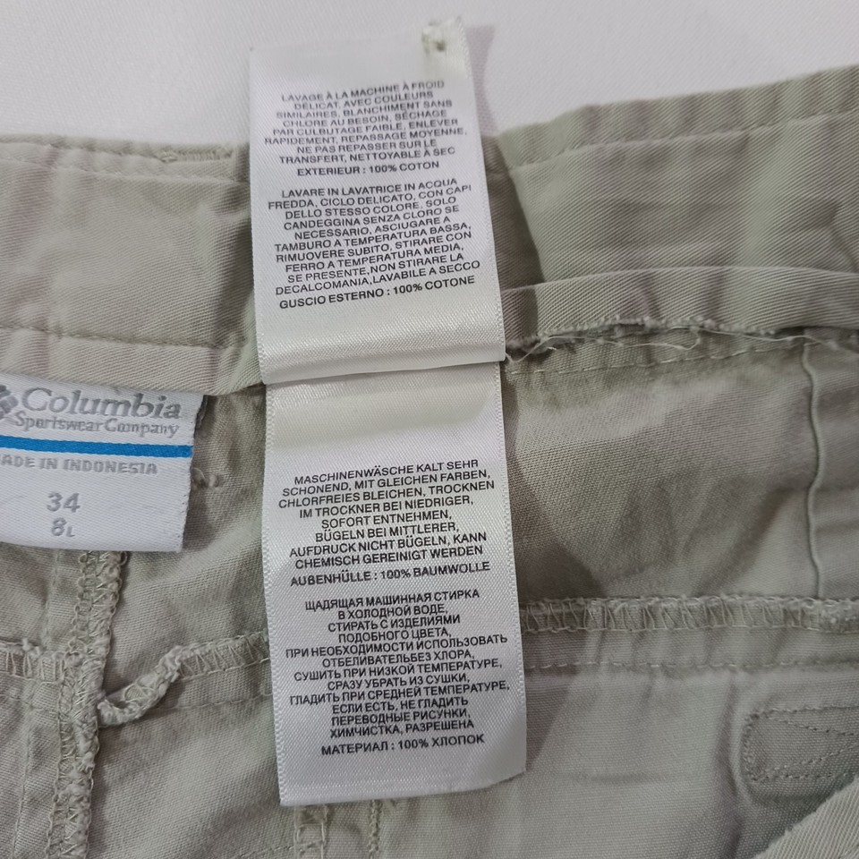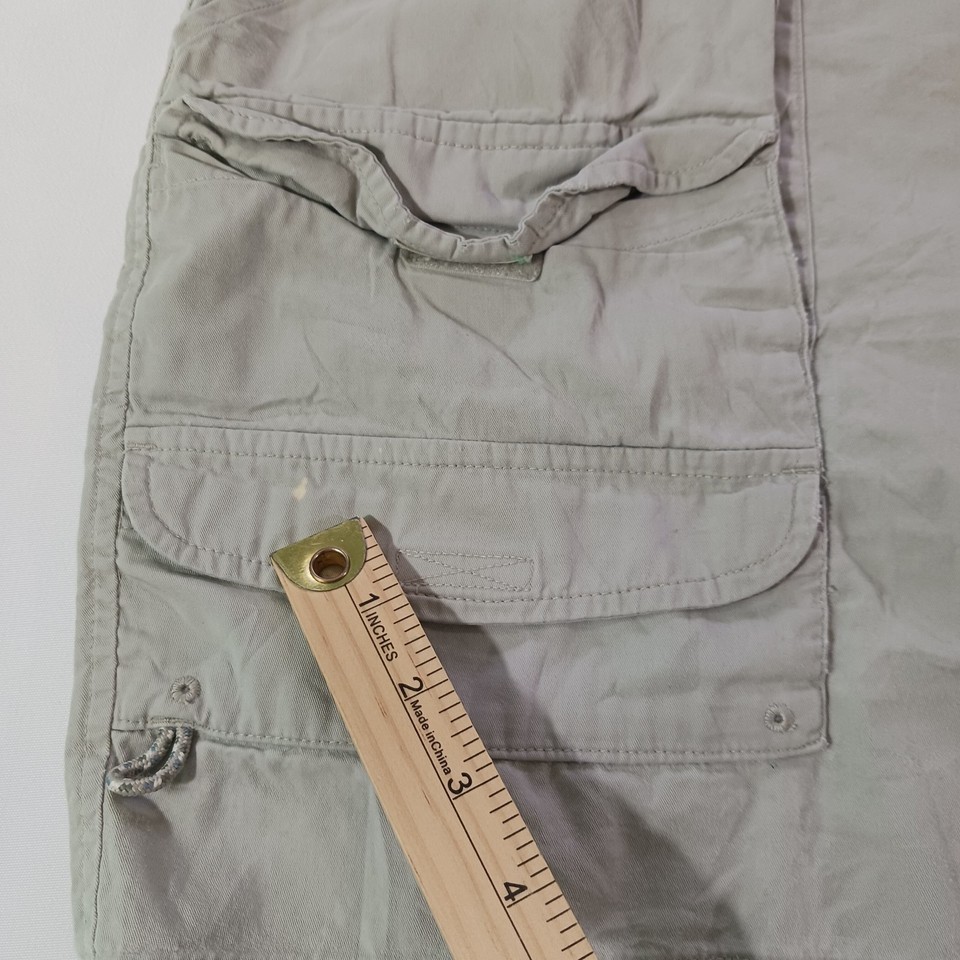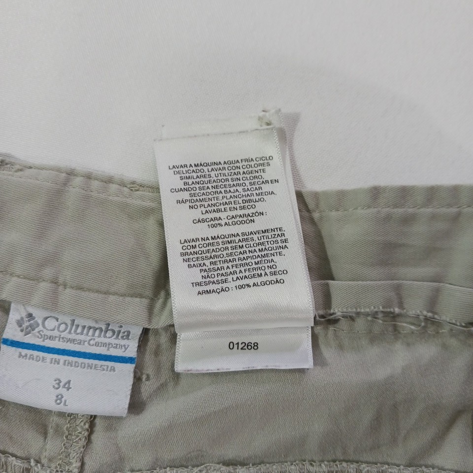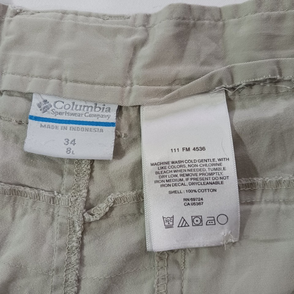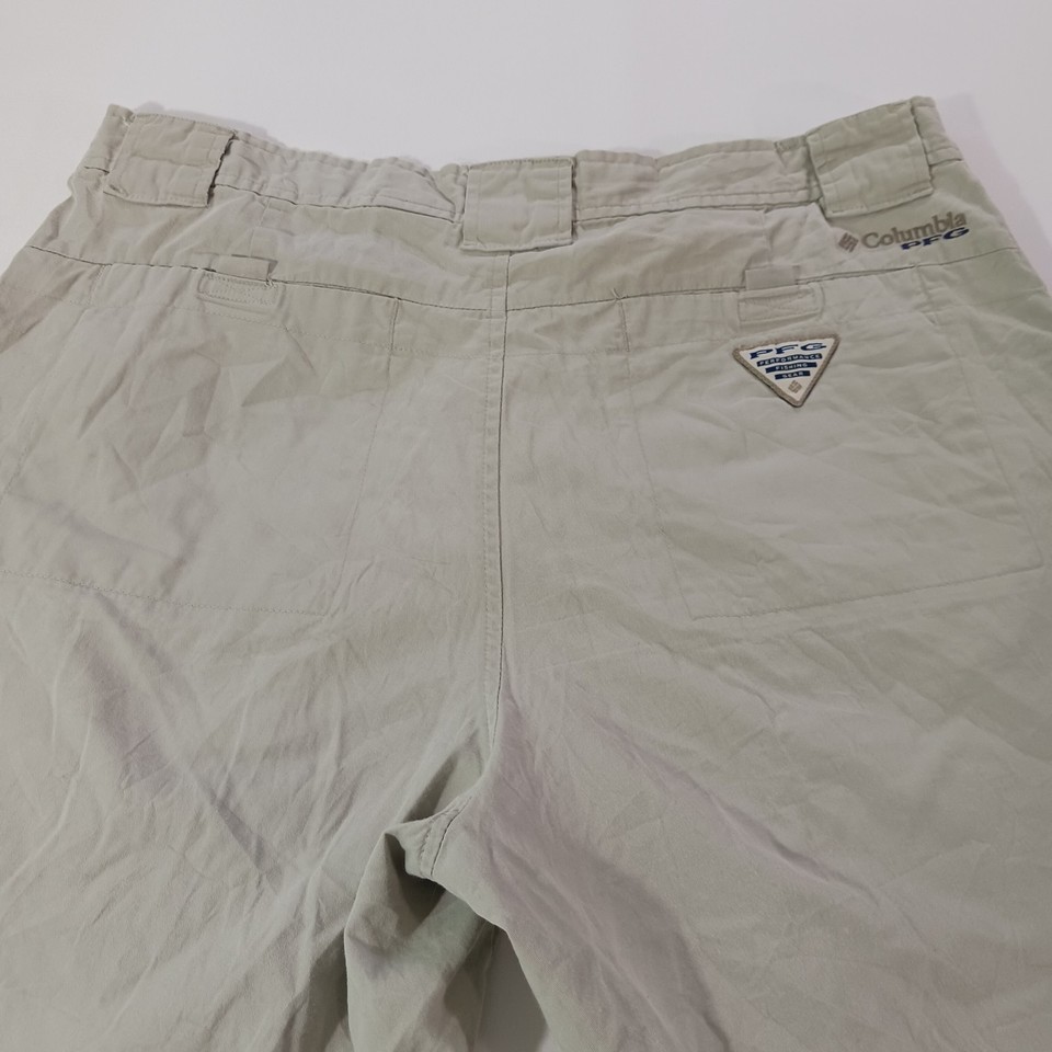 The Columbia PFG Omni-Shade FM4536 Men's Tan Cotton Cargo Shorts in size 34 feature a solid khaki color and a mid-rise style with an 8-inch inseam. Designed for outdoor activities like fishing, boating, hiking, and camping, these shorts are made of lightweight cotton material with a stretchy and quick-drying fabric. The elastic waist provides comfort, while the cargo pockets offer convenient storage. Machine washable and easy to care for, these Columbia shorts are a practical and stylish choice for casual wear.