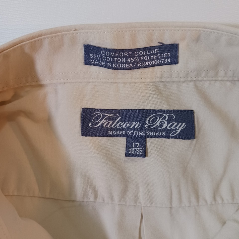 Falcon Bay Comfort Collar Men's Tan/Beige Cotton Blend Shirt is a casual/business button-up shirt with short sleeves and a spread collar. Made of a comfortable cotton and polyester blend, it is perfect for spring and summer. The shirt is solid beige and has a regular fit. It is available in size 17 (32/33).
