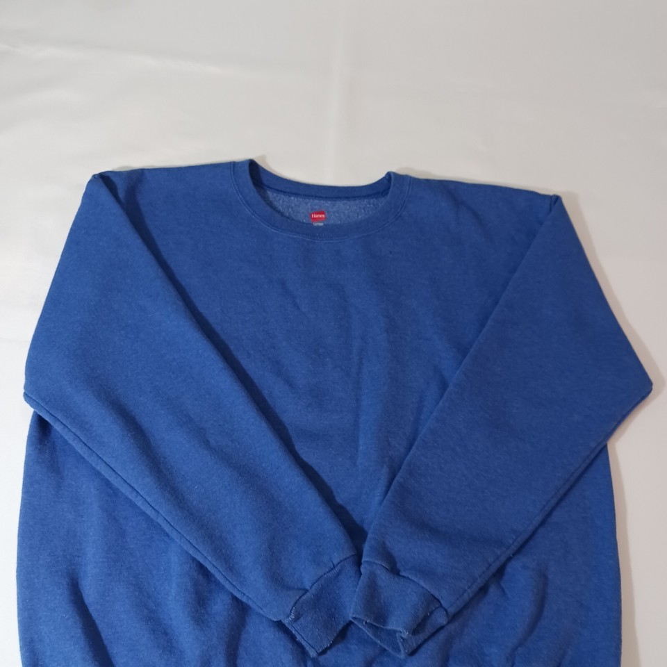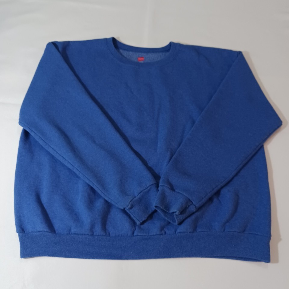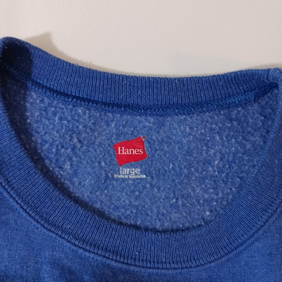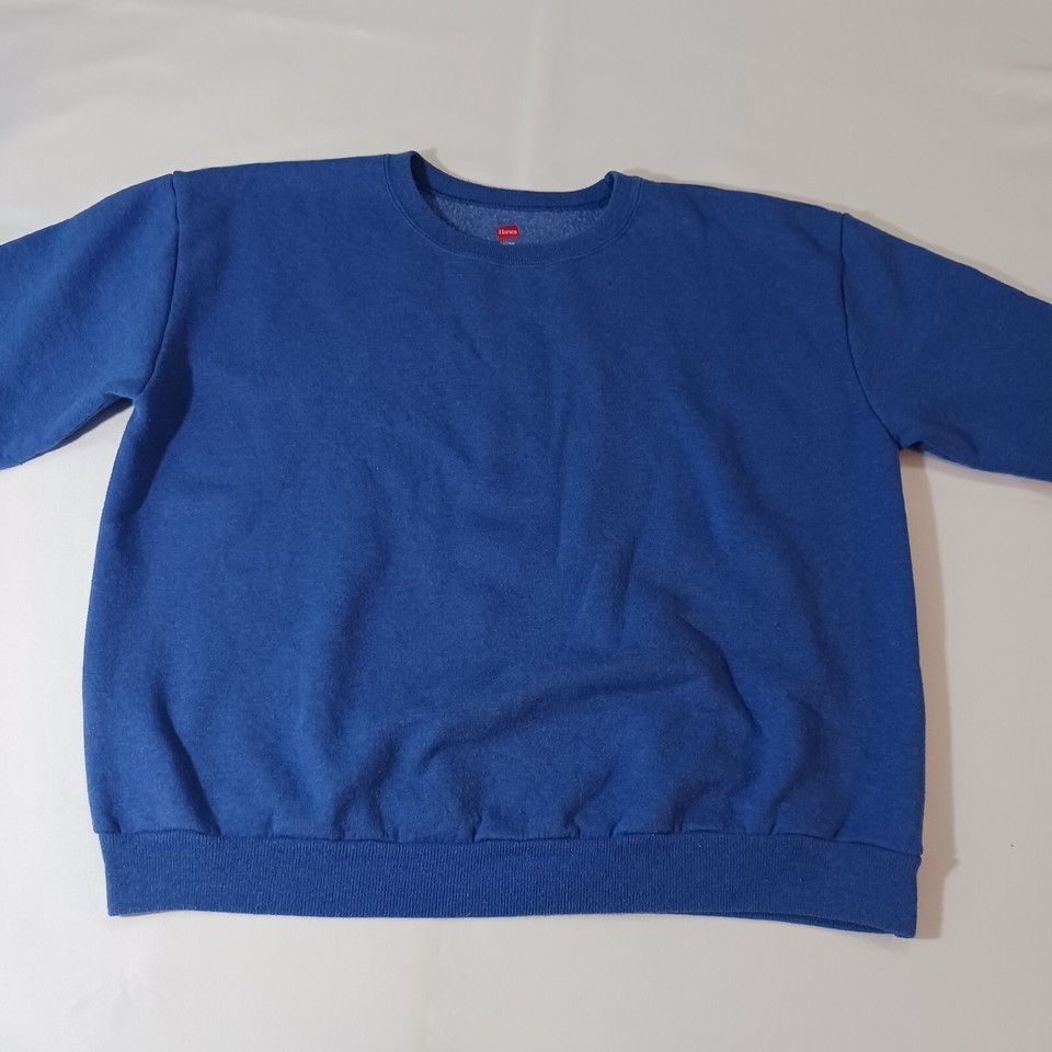 This Hanes women's sweater is a blue pullover sweatshirt made from a cotton blend material. It features a round neck with a V-notch detail, long sleeves, and a solid pattern. The size is large with a chest size of 46 inches, offering a regular fit for everyday wear. Machine washable for easy care, this activewear garment is suitable for casual occasions and has a comfortable and cozy style. Made by Hanes, this sweatshirt is a versatile addition to a woman's wardrobe.