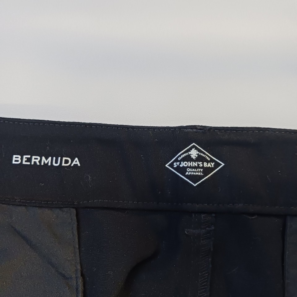 The St John's Bay RN#93677 Women's Black Cotton Bermuda Shorts in size 24W feature a solid pattern with a dark fabric wash. These shorts have a zip closure and are made from a blend of spandex, cotton, and cotton blend materials. The high-rise Bermuda style shorts have a flat front, pockets, and are machine washable. Perfect for plus-size women looking for comfortable and stylish shorts for the warmer months.