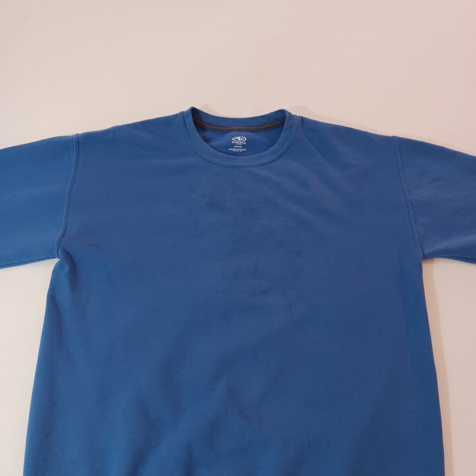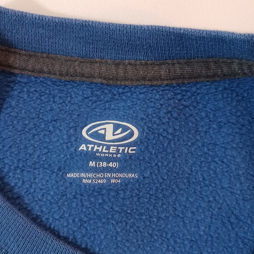 This Athletic Works women's sweatshirt is a blue pullover sweater made of a polyester and cotton blend fabric. It features a crew neck, long sleeves, and a solid pattern, making it ideal for activewear. The size is Medium with a chest size of 41 inches, suitable for a comfortable fit. This stylish and functional sweatshirt is perfect for casual and athletic activities, adding warmth and style to your wardrobe.