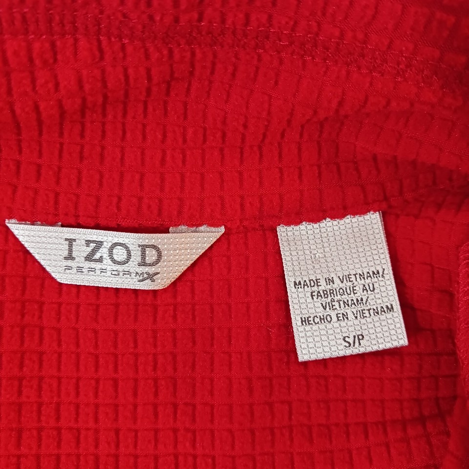 This Izod Performx sweatshirt is a men's size small in solid black color with a long sleeve and mock neck design. Made of a blend of polyester, spandex, and cotton, the sweatshirt features a 1/4 zip closure and the Izod logo accent. It is a pullover style garment perfect for activities like golf, with a regular fit and machine washable fabric. Ideal for a casual and sporty look, this sweatshirt combines comfort and style for everyday wear.