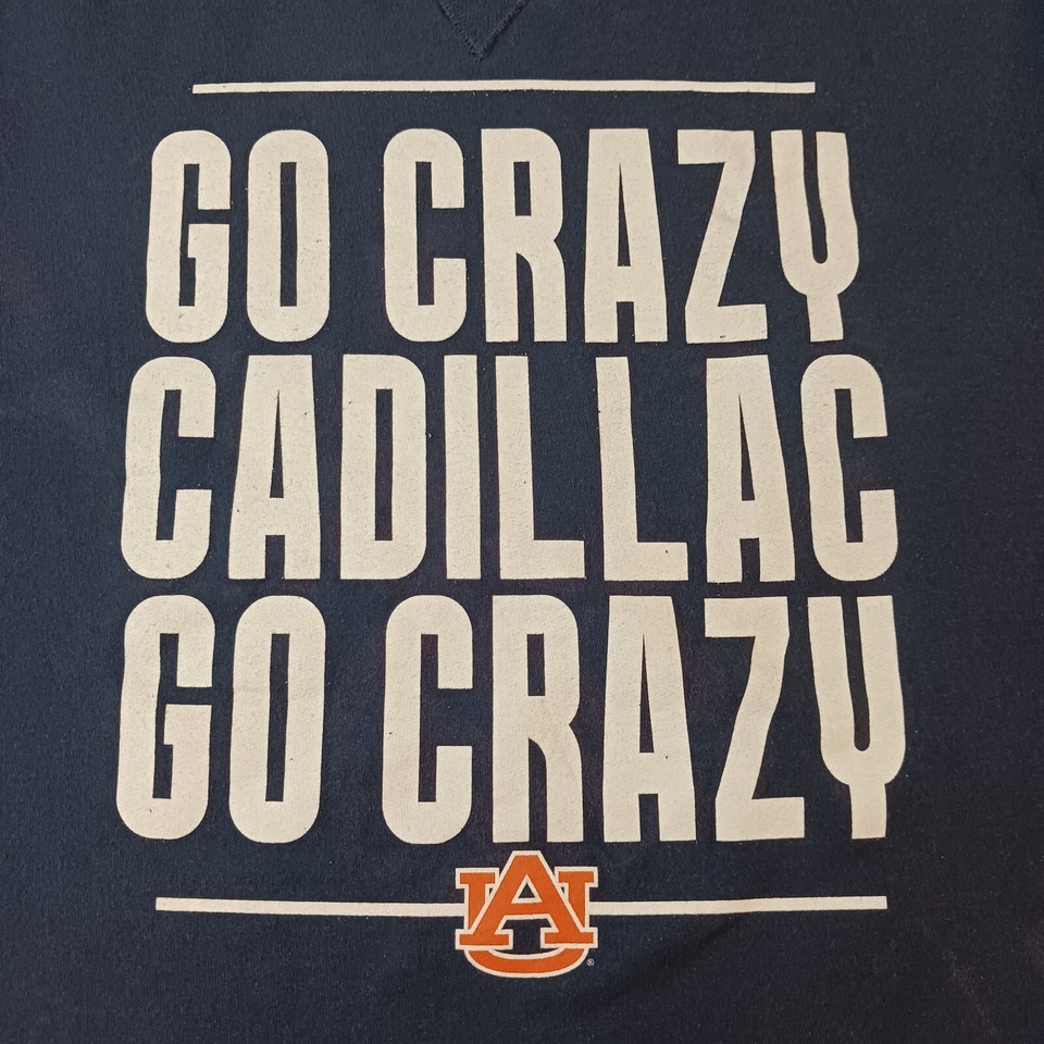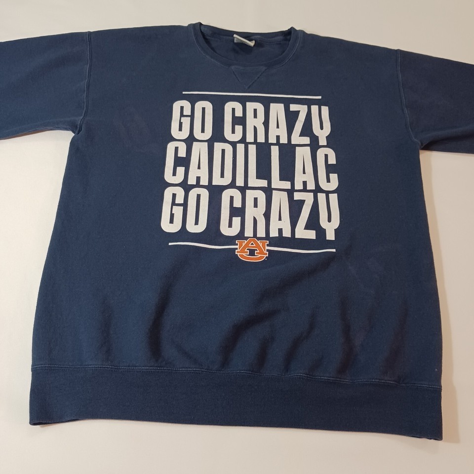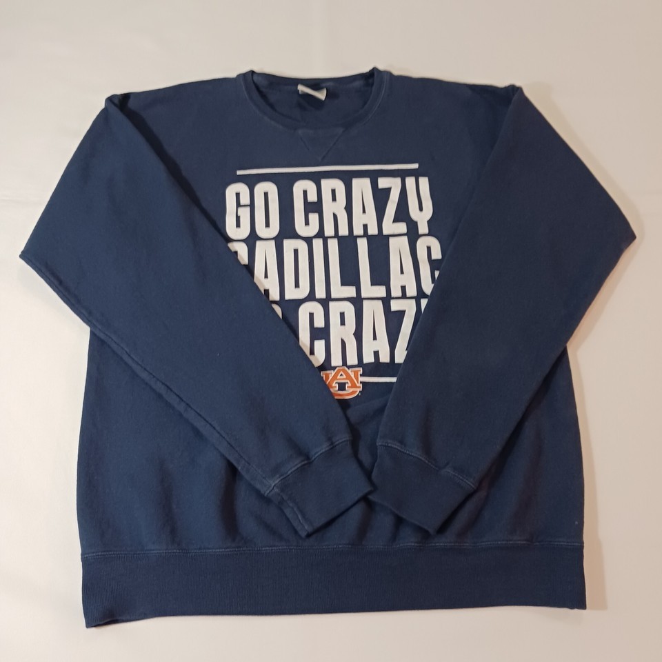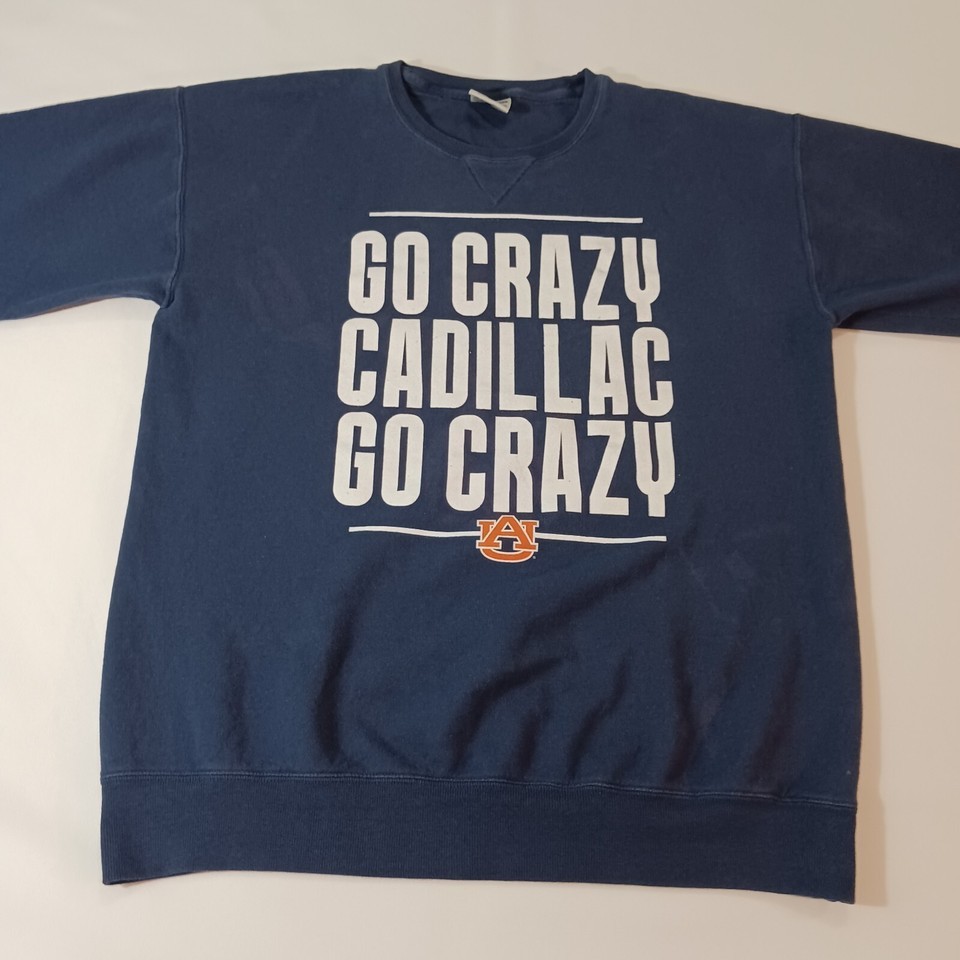 This Comfort Wash GO CRAZY CADILLAC sweater is a stylish choice for Auburn Tigers fans. Made of a polyester and cotton blend in a knit fabric, it features a solid blue color with a graphic print of the team's logo. The sweater has a crew neck, long sleeves, and a pullover closure, offering a regular fit in size M. Perfect for colder seasons, this lined sweater is machine washable and ideal for activities like walking and running, making it a practical and comfortable choice for college football enthusiasts.