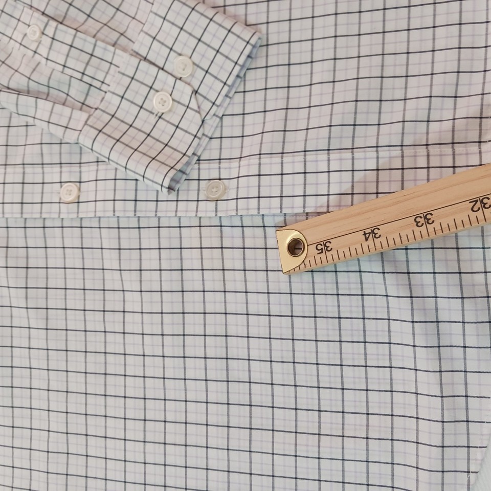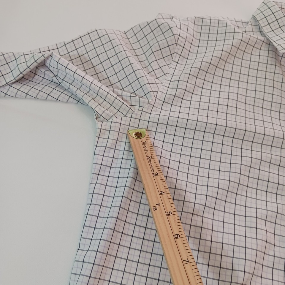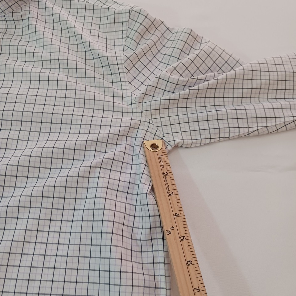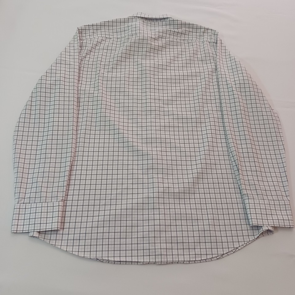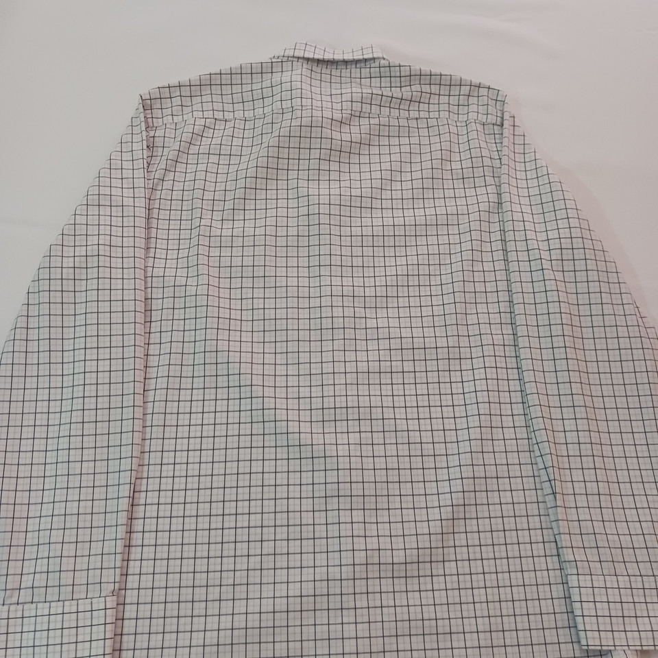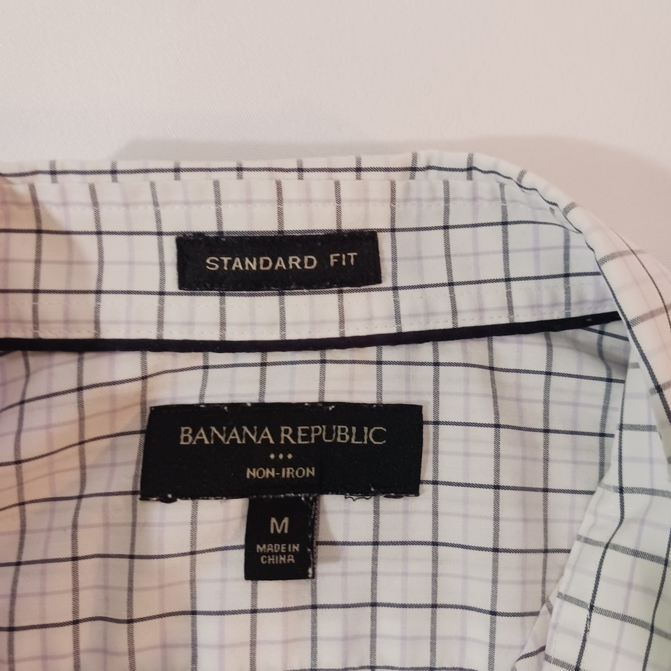 This is a Banana Republic men's dress shirt in size Medium, featuring a white and gray plaid pattern with a collared neckline and button closure. The shirt has long sleeves with barrel cuffs and a spread collar style. It is made from a lightweight, breathable fabric that is easy to care for and packable, suitable for all seasons. With a standard fit and a chest size of 44 inches, this shirt is versatile for various occasions including travel, weddings, parties, workwear, and more.