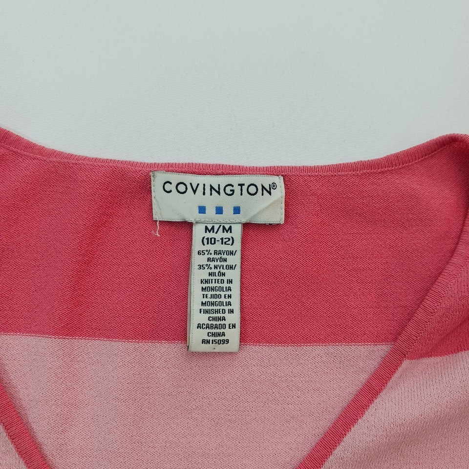 Look stylish in this Covington RN#15099 Women's Pink White Striped 3/4 Sleeve Pullover Shirt. The shirt features a V-neckline and a colorful striped pattern that adds a pop of color to any outfit. It is made of a knit fabric that is a blend of nylon and rayon, making it comfortable and soft to the touch.