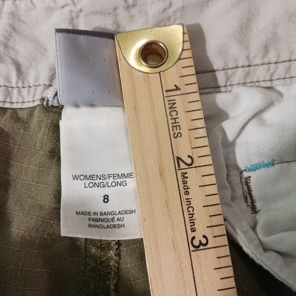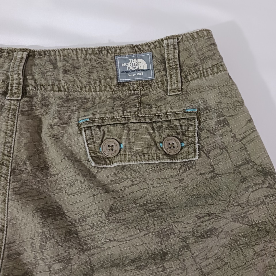 These green cotton hiking shorts from The North Face's A5 Series are designed for women in size 8 with a waist of 36 inches and an inseam of 11 inches. Featuring a classic fit and a mid-rise, these cargo shorts are suitable for casual outdoor wear in summer, fall, and spring seasons. The shorts come with slash pockets, a button closure, belt loops, and The North Face logo accents, making them both functional and stylish for hiking or other outdoor activities.