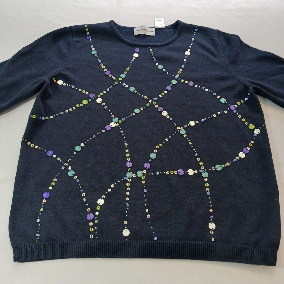 Elevate your wardrobe with this stylish and comfortable Alfred Dunner RN#19232 sweater top. Made from a cotton and acrylic knit fabric, this classic fit sweater features a crew neckline and casual sleeve type with a pullover closure. The textured accents add a unique touch to this solid blue sweater, making it suitable for travel, casual outings, and business meetings.