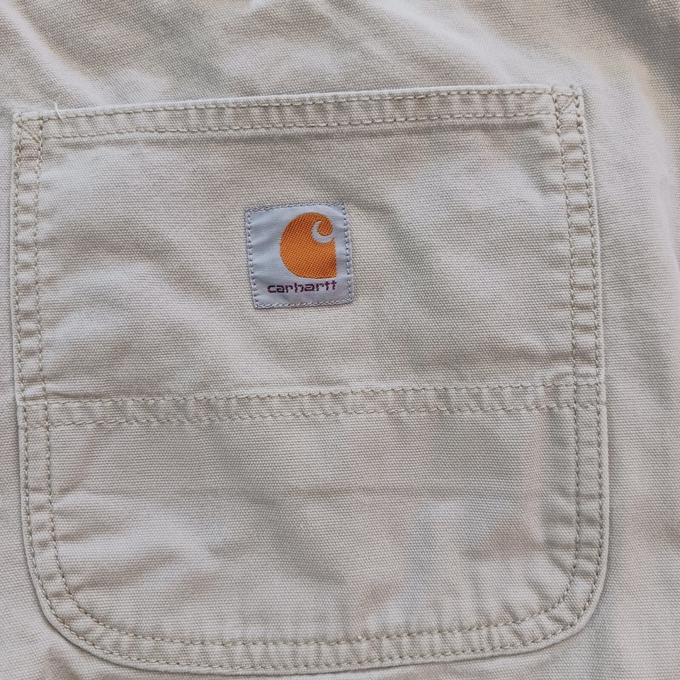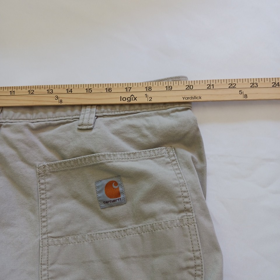 These Carhartt pants for men are made with durable cotton canvas material, perfect for any season. The relaxed fit and straight style provide comfort and versatility, while the beige color and solid pattern add a touch of style. The pants feature a zip and button closure, with accents including a strap, zipper, and Carhartt logo.