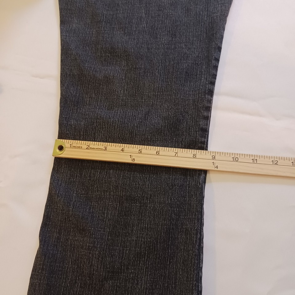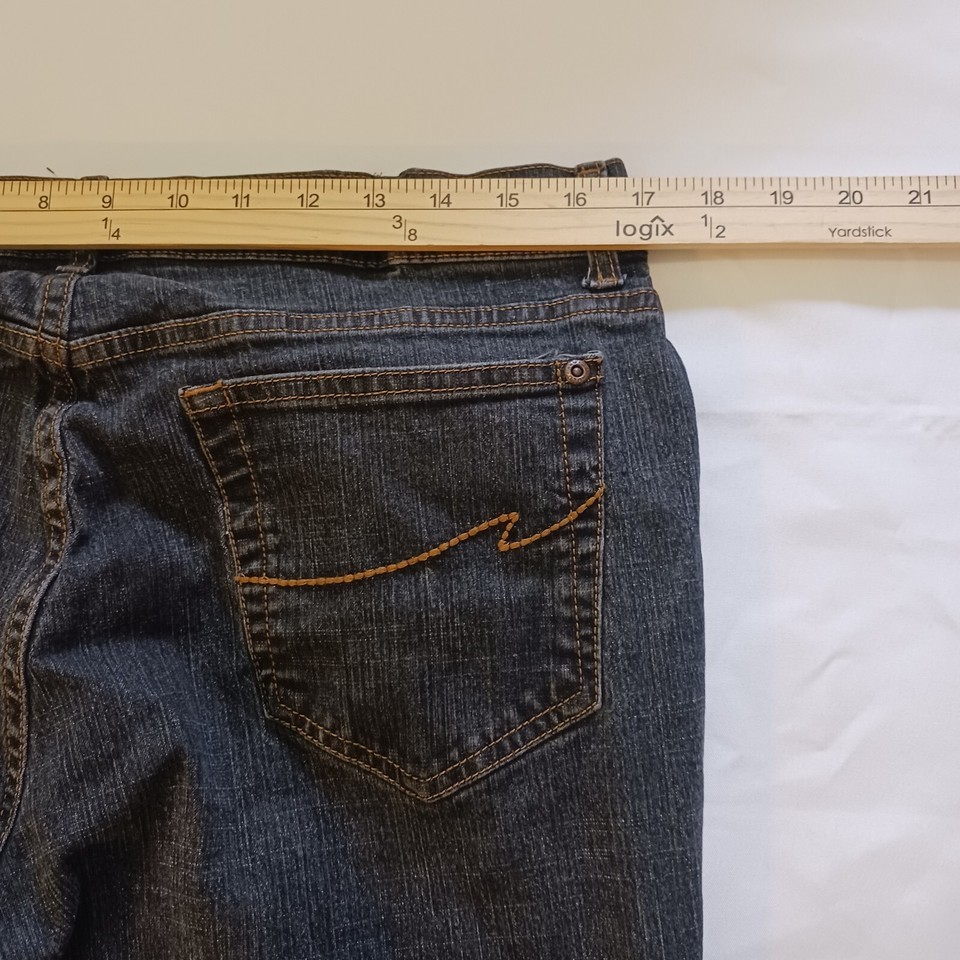 These Faded Glory black bootcut jeans for women are perfect for any season and feature a 5-pocket design with a zip closure. The fabric type is denim, with a dark wash and a solid color pattern. The waist size measures 34 inches, while the inseam is 28 inches, making it a perfect fit for women's size 16P.