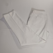 The product is a pair of Black Label by Chico's jeans for women in a cotton blend fabric. The jeans feature a zip and button closure, a mid-rise fit, a straight style with a 28-inch inseam, and a 5-pocket design. The size is 31 inches in the waist. The jeans are machine washable and have a solid white color. Made with polyester, spandex, and cotton, these jeans offer a comfortable and stylish option for year-round wear.