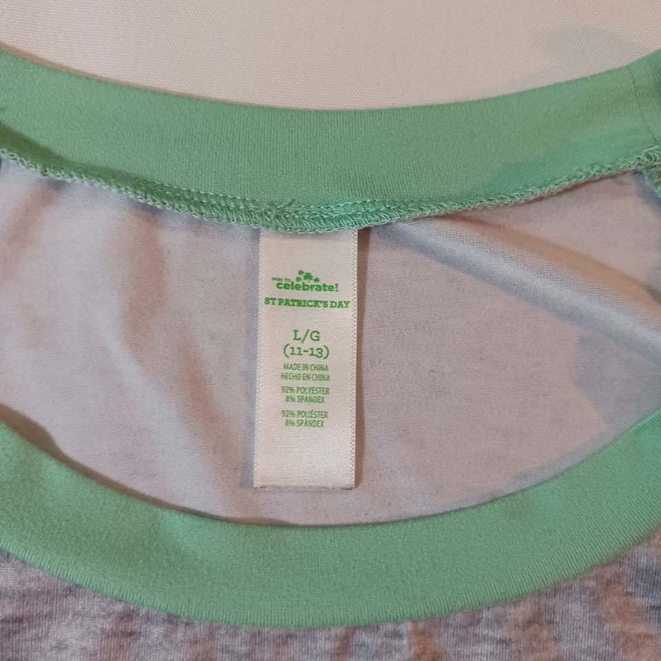 Celebrate St. Patrick's Day in style with this green and gray raglan shirt! Made from a blend of polyester and spandex, this shirt is both comfortable and machine washable. The 3/4 sleeve shirt features a crew neckline and glitter accents, giving it a touch of glamour.