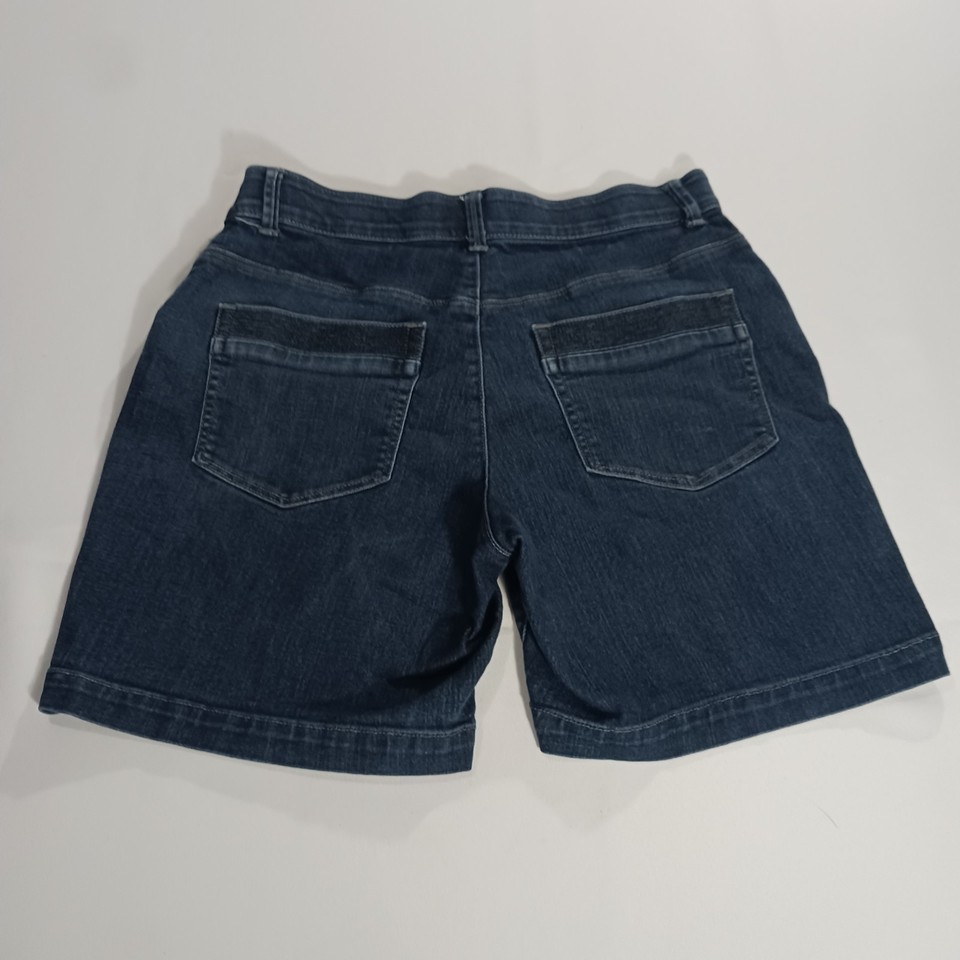 The product is a pair of Lee Comfort Stretch Waistband women's blue shorts in size 8 medium. These shorts feature a solid pattern, zip closure, and are machine washable. Made from a blend of polyester, spandex, and cotton, they have a mid-rise and a 7.5 inch inseam, making them perfect for casual occasions or travel during the summer, fall, or spring seasons. The shorts also come with belt loops and pockets for added convenience and comfort.