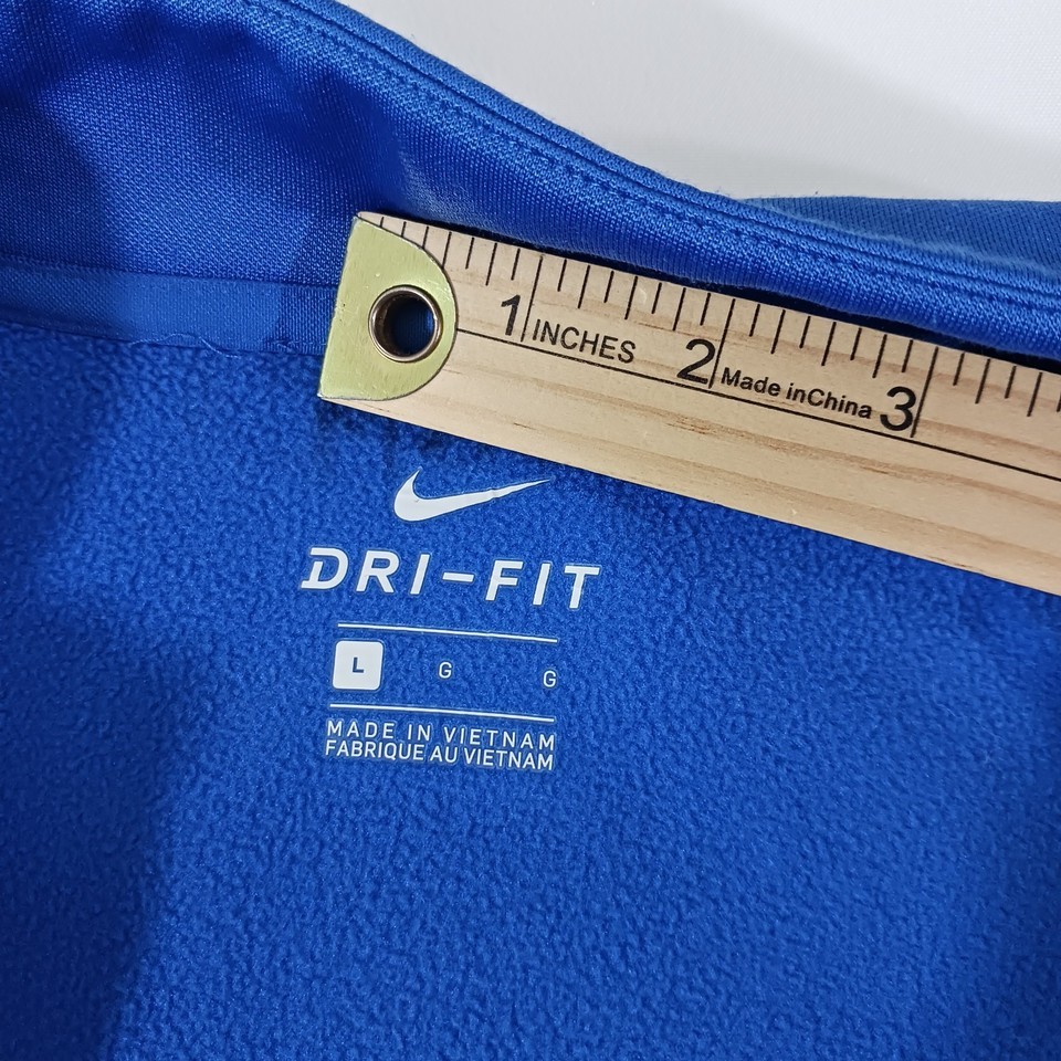 This Nike jacket is a men's size large, featuring a full zip closure and long sleeves, making it ideal for activewear, specifically for golf. The jacket is made of polyester fleece material in a solid blue color, with a Nike Therma product line tag. With a chest size of 48 inches and a shirt length of 28 inches, this casual and basic style jacket is designed for comfort and performance during golf activities.