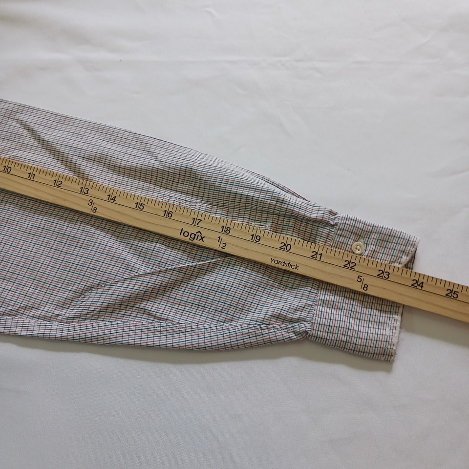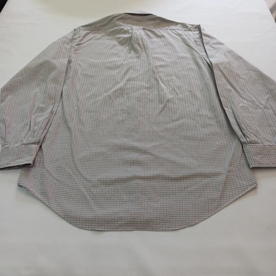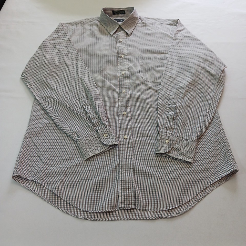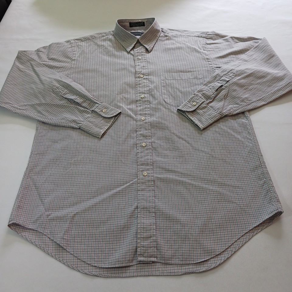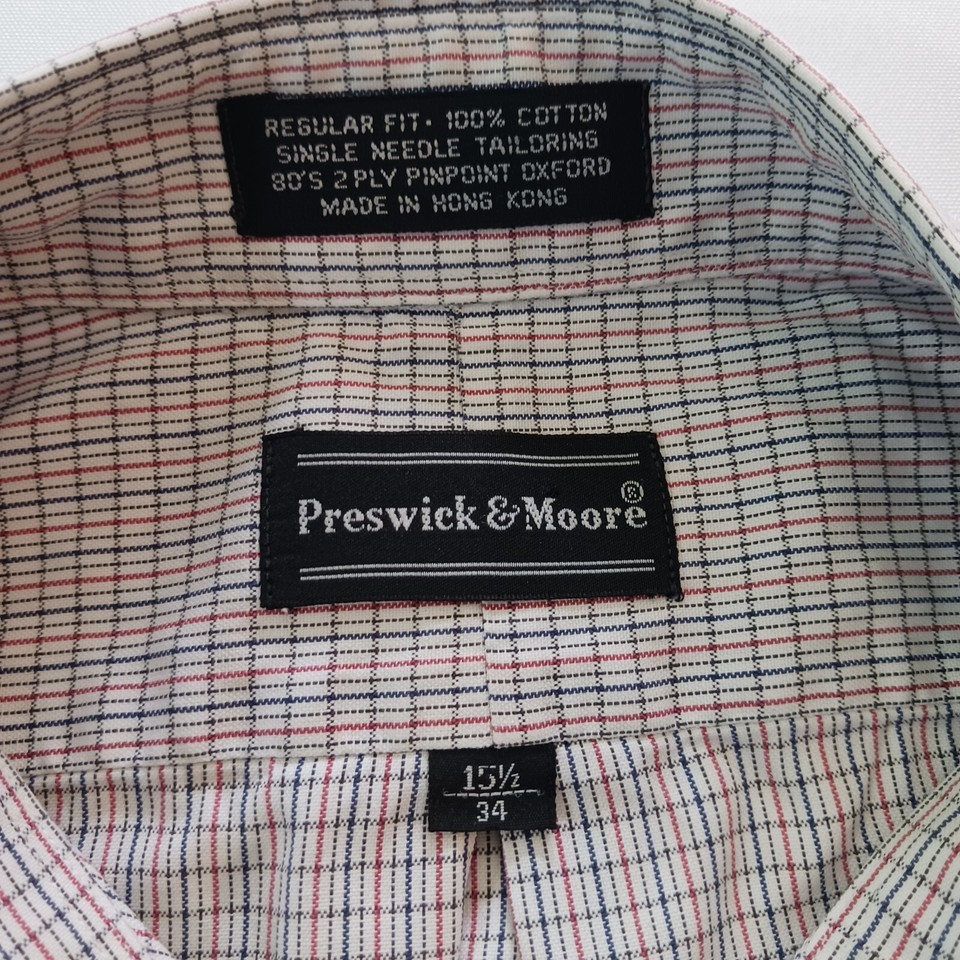 This is a pre-owned Preswick Moore men's dress shirt with a spread collar and long sleeves. It is made of cotton and features a multicolor striped pattern. The shirt is a regular size 15.5 and has a button-up front. It was manufactured in Hong Kong.