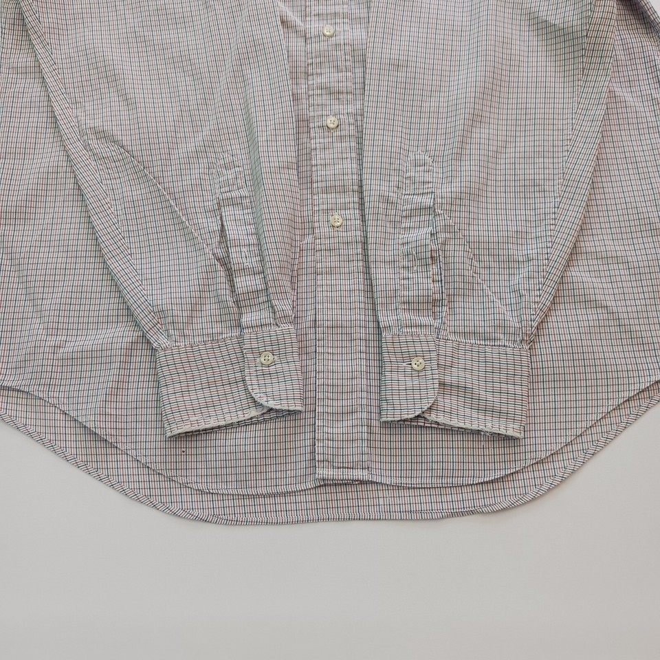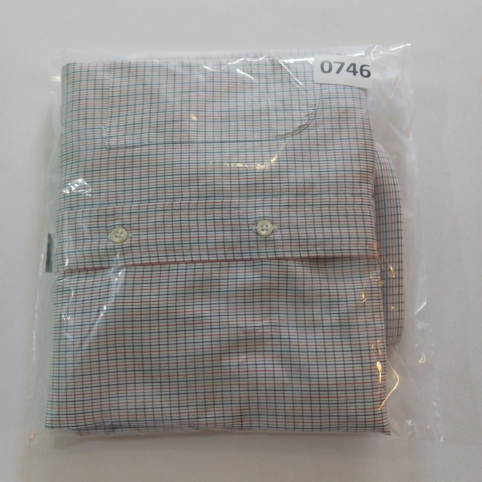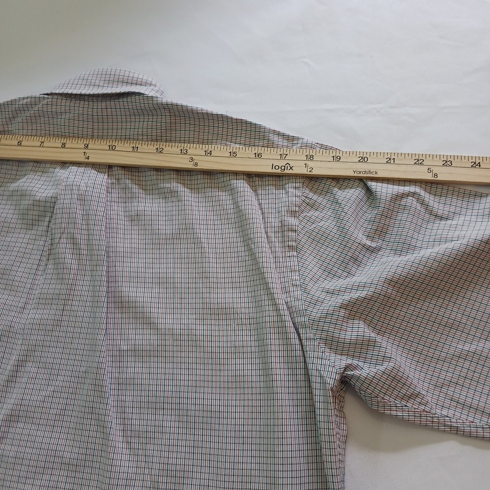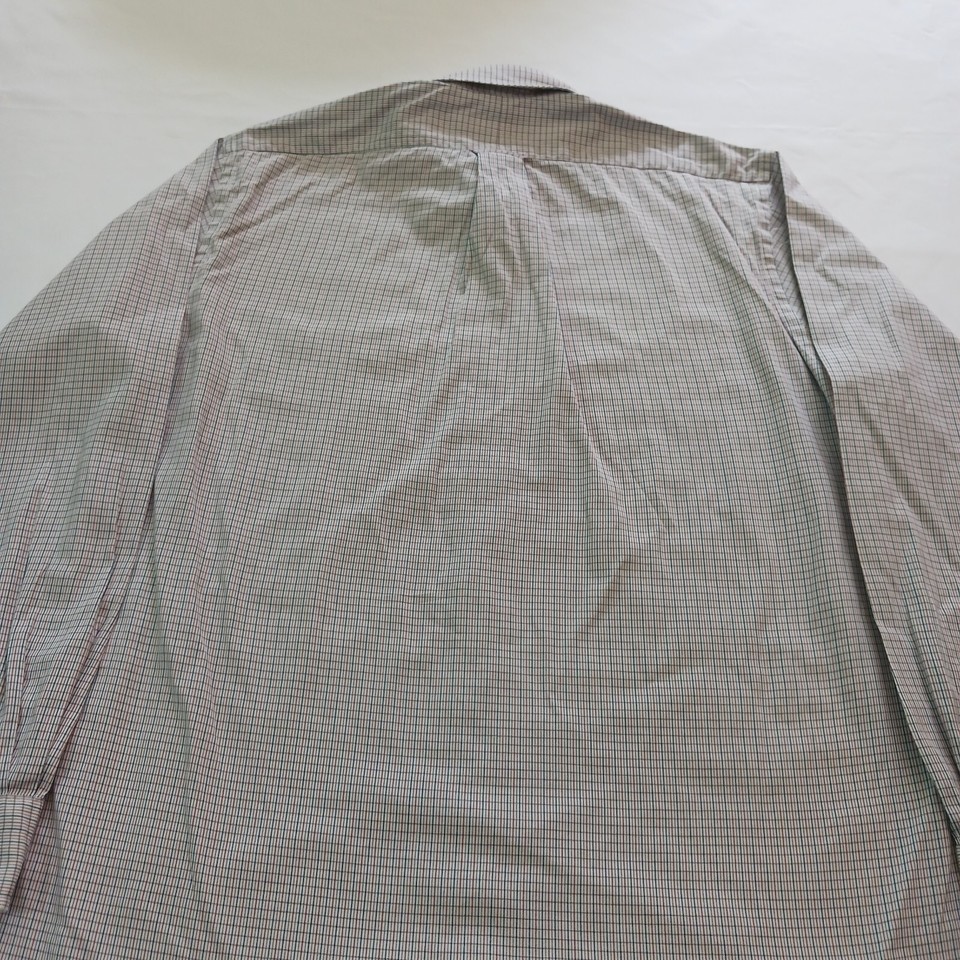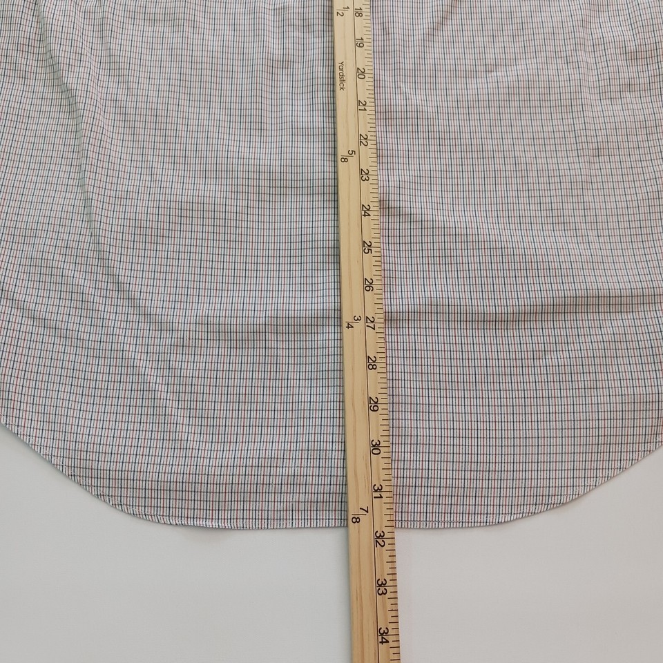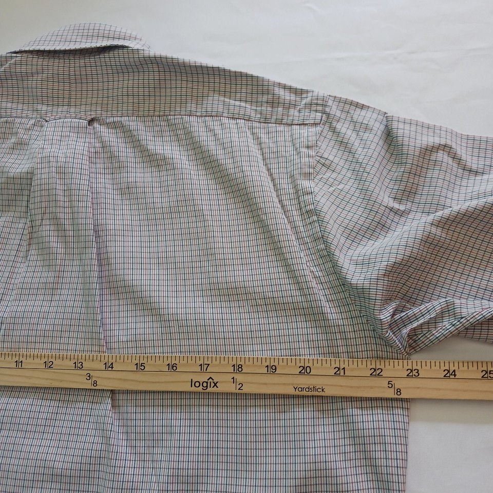 This is a pre-owned Preswick Moore men's dress shirt with a spread collar and long sleeves. It is made of cotton and features a multicolor striped pattern. The shirt is a regular size 15.5 and has a button-up front. It was manufactured in Hong Kong.