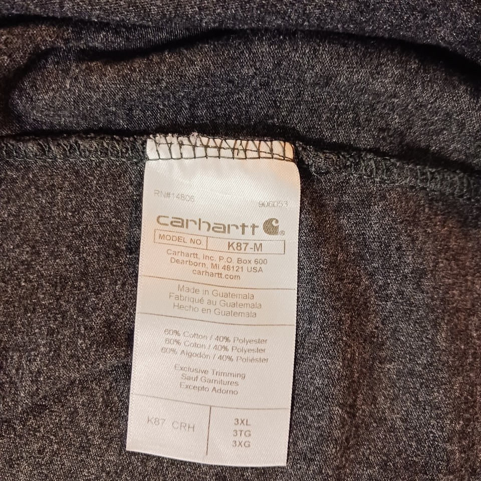 This Carhartt K87-CRH men's t-shirt is made of a comfortable cotton blend fabric with a solid pattern in a gray color. The short sleeve t-shirt features a regular fit and is available in size 3XL. It has a pocket and is part of the Carhartt Men's K87 product line. The t-shirt is made in Guatemala and is perfect for work or casual wear.