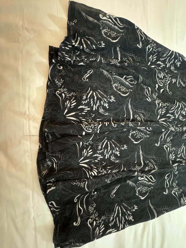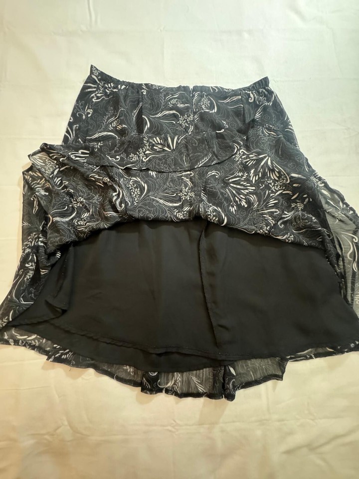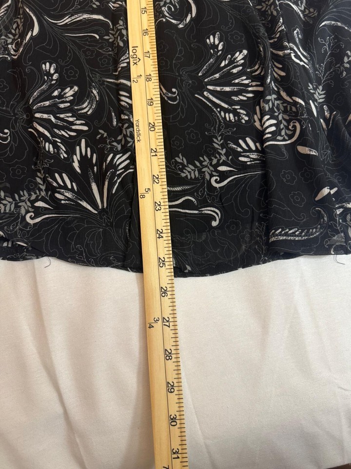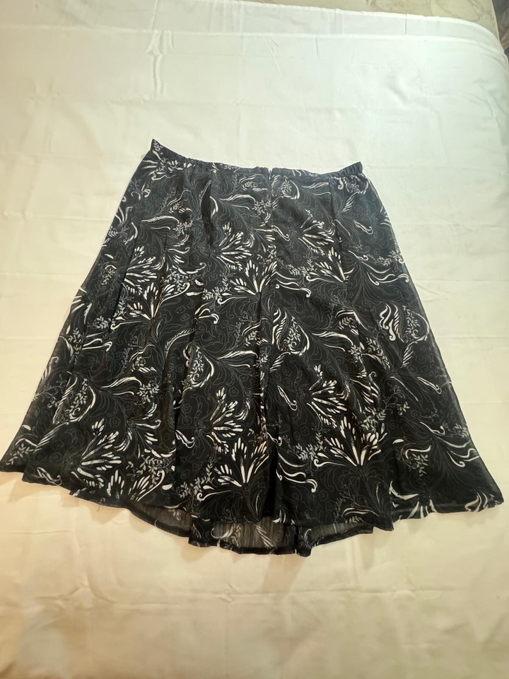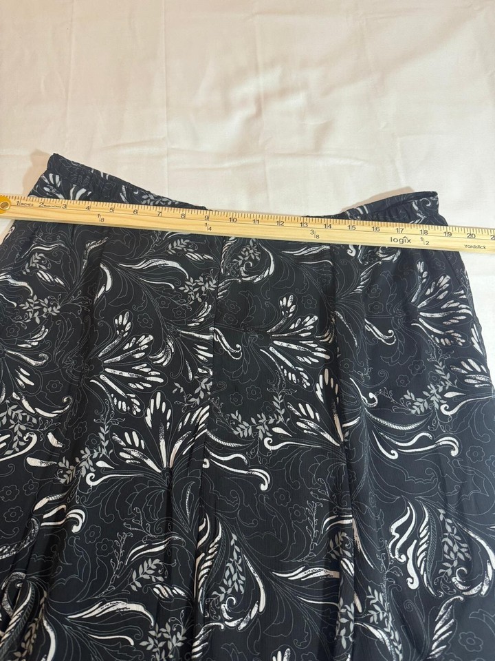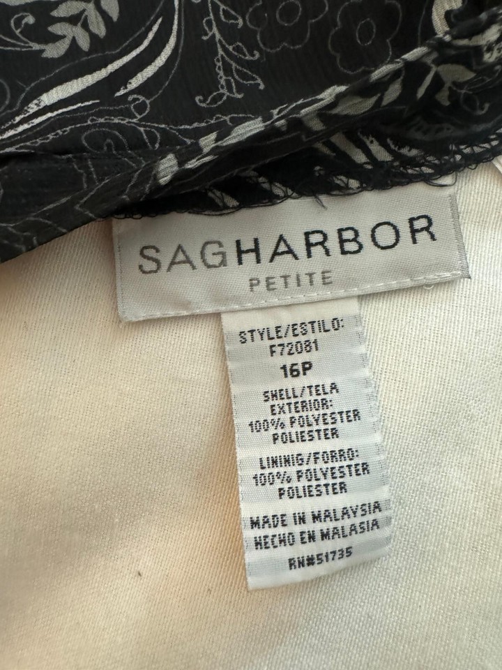 This is a Sag Harbor women's petite black floral skirt in size 16P. The skirt features a floral pattern, a flare style, and a length of 25.5 inches. It is made of polyester and has a pull-on closure. This skirt is designed for petites and offers a stylish option for women's clothing, suitable for various occasions and events.