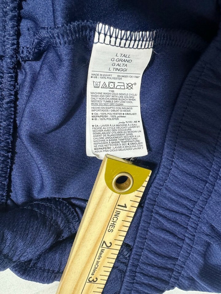 The Old Navy Active Go-Dry Men's Blue Drawstring Shorts are designed for athletic wear, featuring a solid blue color with a logo and sports theme. Made from a polyester blended fabric, these shorts are lightweight and have an elastic waist with a drawstring for a comfortable fit. The Size L Tall (319.5) is suitable for big and tall men, with an athletic fit perfect for gym training or running activities. These shorts are ideal for men looking for performance-enhancing activewear.