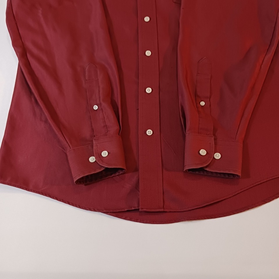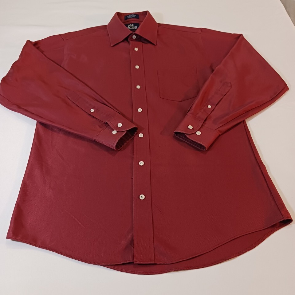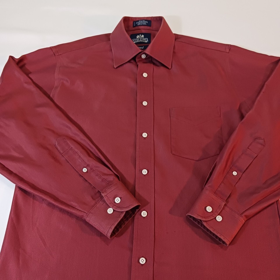 Stafford Wrinkle Free Men's Long Sleeve Casual Button Up Red Shirt is a regular fit shirt made of cotton material. It has a collared neckline, spread collar style, and button closure. The shirt is solid red with button accents and is suitable for casual occasions. It is a size 16 with a sleeve length of 34-35 inches. The shirt is designed for all seasons and was made in Taiwan.