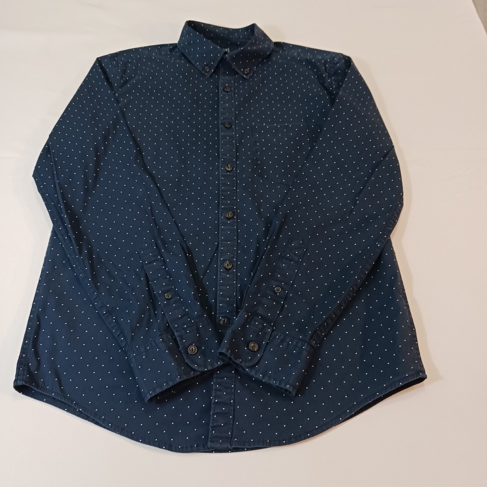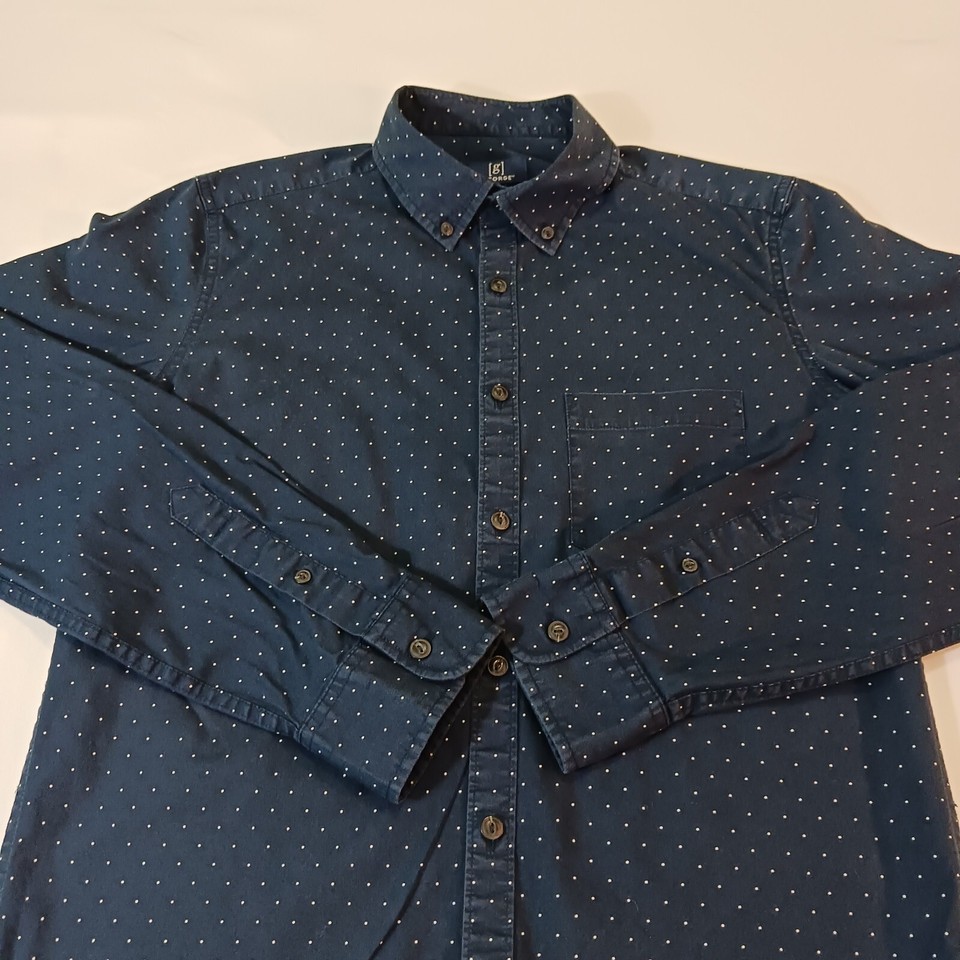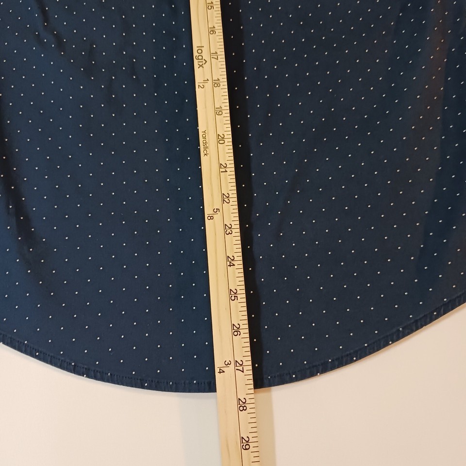 The George Classic Fit Button-Down Collar Mens Blue Shirt is a pre-owned casual button-down shirt made of spandex and cotton. It features a polka dot pattern, long sleeves, and a button closure. The collar is collared and button-down, and the shirt is machine washable. It is a regular fit and comes in size S (34-36). The shirt is suitable for casual, workwear, and business occasions. The brand is George, and it was made in Bangladesh.