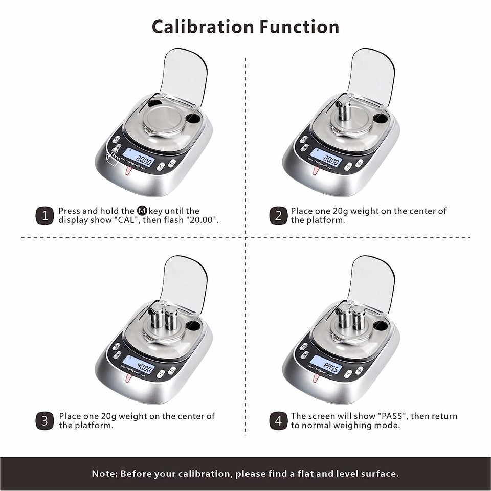 Equipped with a calibration function and tare function, ensuring that you can calibrate the scale and zero out the weight of any container or accessory placed on the scale, respectively. It also includes 2*20g calibration weights to simplify the calibration process.