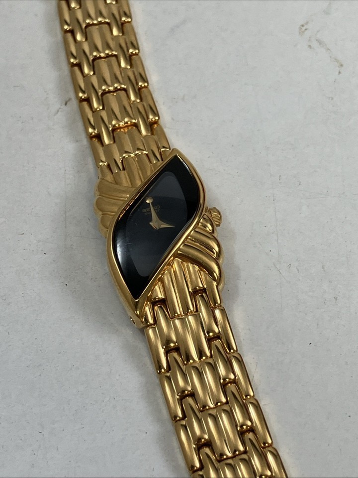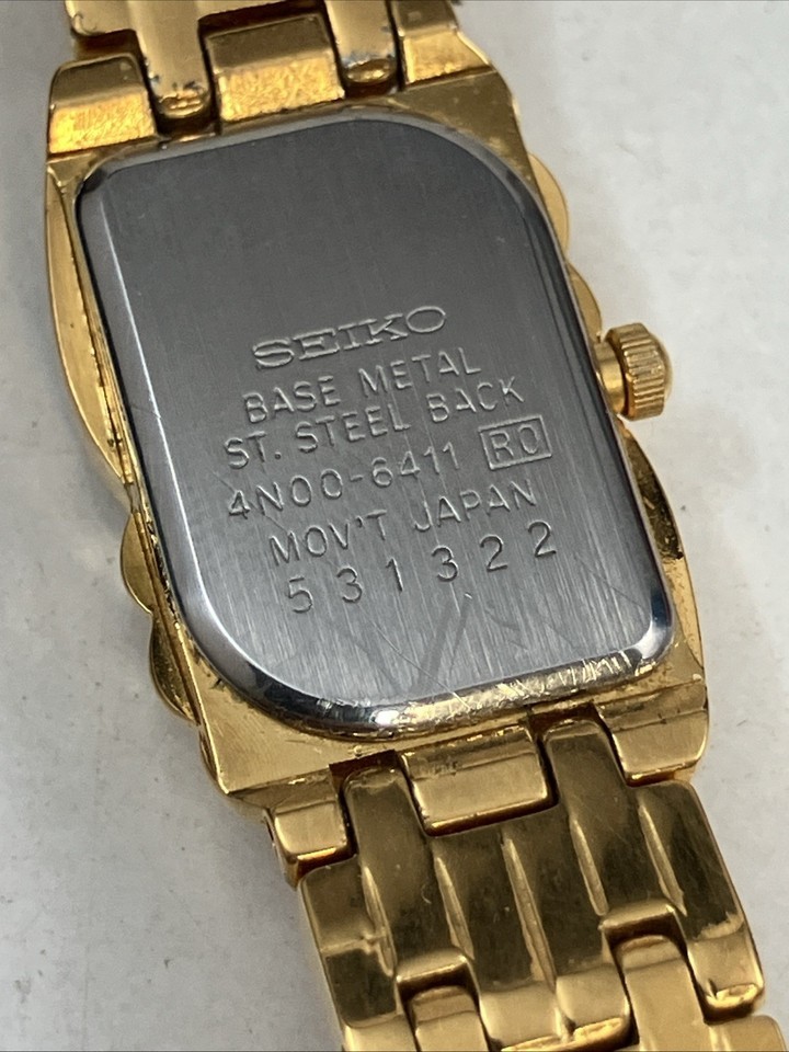 This rare Seiko Asymmetrical Watch, model number 4N00-6411, with a Japan Movement and a new battery is a vintage piece from the 1990s. This women's watch features a gold bezel, case, and band, with a solid black dial and dot indexes. The unique asymmetrical shape, along with its dress/formal, casual, and classic style, makes it a timeless accessory. This Seiko Quartz watch has a 28mm case size, a 7.6mm case thickness, and a two-piece strap with a 12mm band width. Its polished gold case finish and push/pull crown add to its elegance, making it a standout piece for any watch enthusiast.