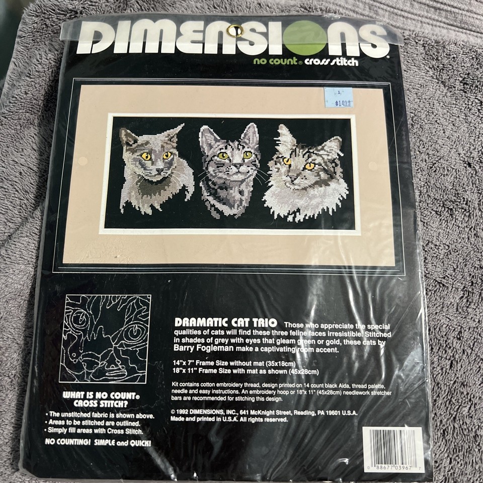 The Dimensions Cross Stitch Cat Trio 1992 NOS thread Complete Kit is a vintage cross stitch kit featuring a charming cat-themed design. Made in the United States by the brand Dimensions, this kit includes everything needed to create a beautiful hand-stitched piece without the need for a no stitch format. Perfect for cat lovers and cross stitch enthusiasts, this kit model 3967 offers a creative and relaxing project to enjoy.