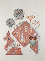 David Sharir was born in 1938 in Israel, the son of Russian immigrants. He began his study of art in Tel Aviv and continued in Florence and Rome where he studied architecture and theater design. His set designs include such productions as Peer Gynt for the Habima, Israel's National Theater (1970-71) and Hansel and Gretl for the Opera Company of Boston (1978-79). The brightly colored costumes and intricate stage designs he created for these productions have profoundly influenced his art. In 1966, Sharir moved to Jaffa and it was here that his hallmark style was truly developed. His studio, his family, and his spiritual devotion all serve as inspiration for the imagery in his work. His evolving style combines personal experience, Biblical symbolism, and fantasy. Today, Sharir has earned a place as a leading Israeli artist. The artist currently resides in Tel Aviv where he continues to live and work in the spirit of celebration. (Source:Pucker Gallery)