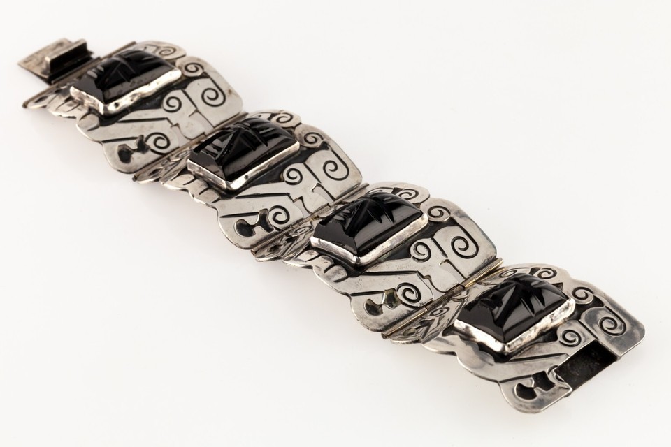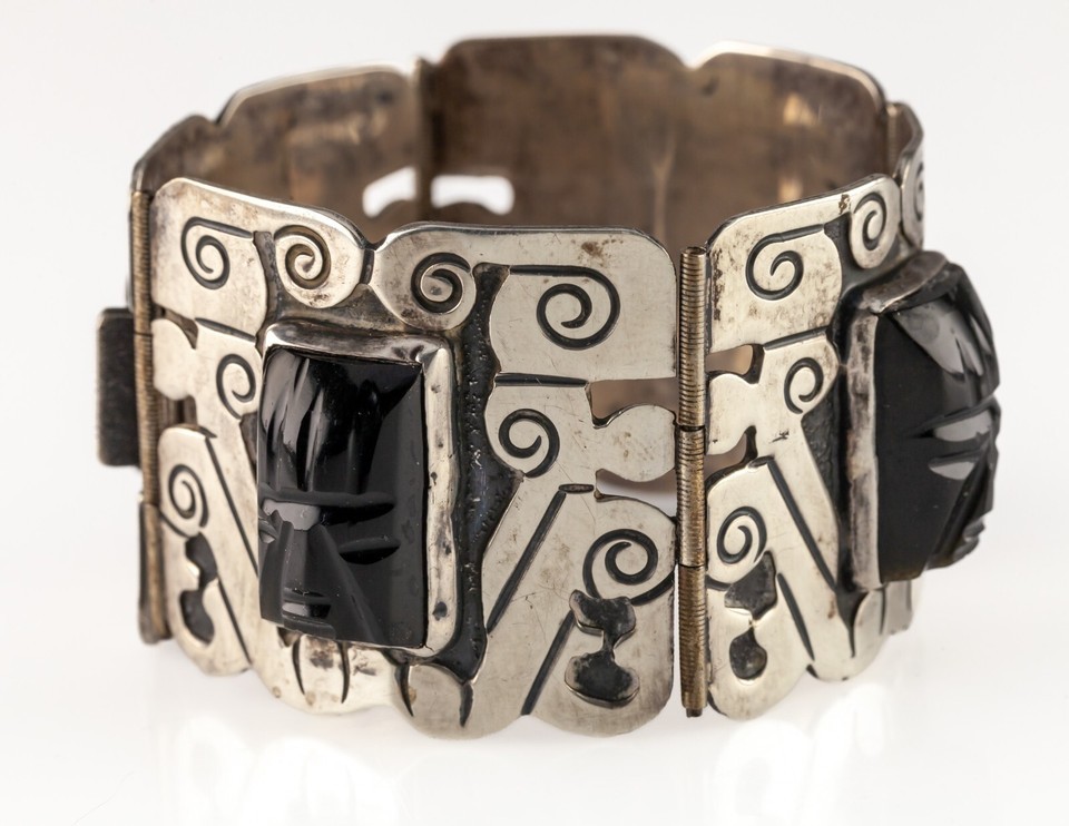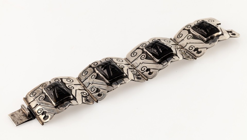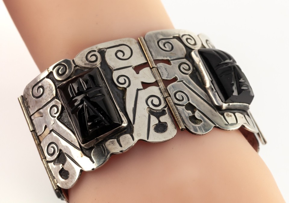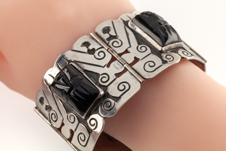 Mid Century Plateria FARFAN Sterling Silver Onyx Wide Panel Bracelet 7.25"
