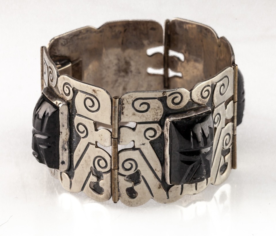 Hand made bracelet with bezel set Carved Black Onyx in the form of Masks (4) in Aztec inspired Panels